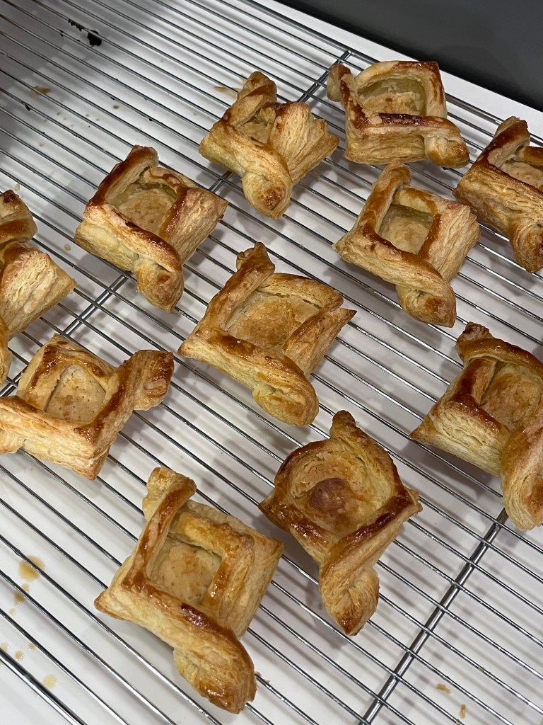 I had one Trader Joe’s package of puff pastry in the freezer (I now make my own) and lots of scraps of 54% dark chocolate left over from making the confections. Easy peasy!