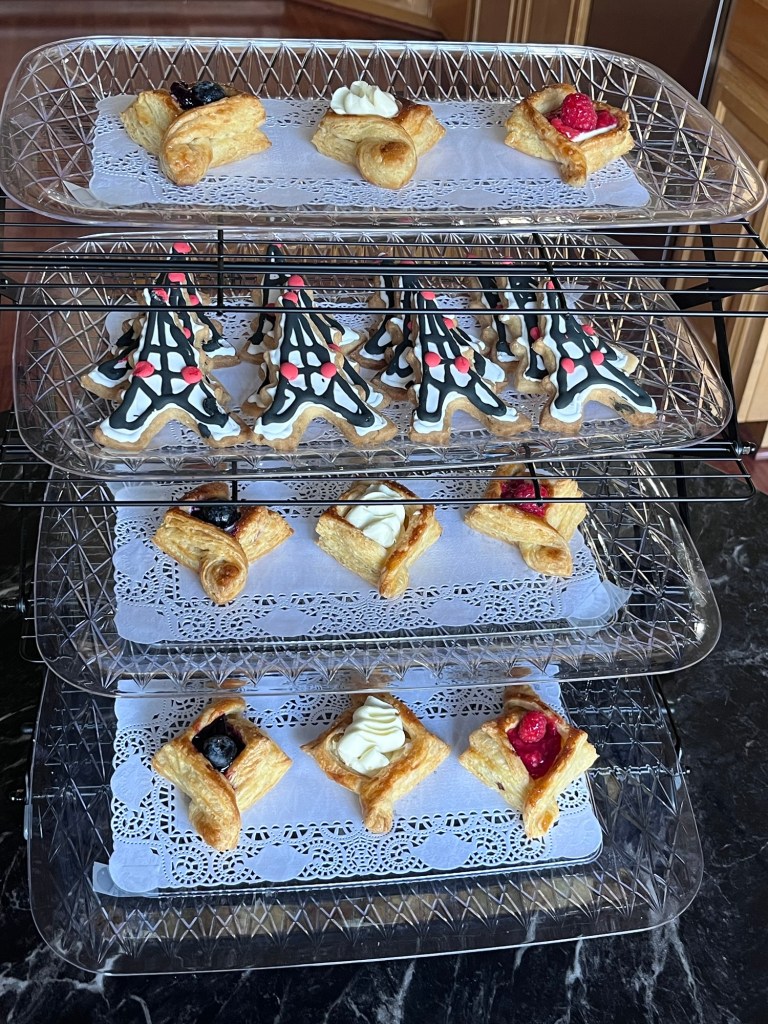 I made filled puff pastries in the color of the French flag (blue, white and red.) I made blueberry, white chocolate/cream cheese ganache, and raspberry pastries.