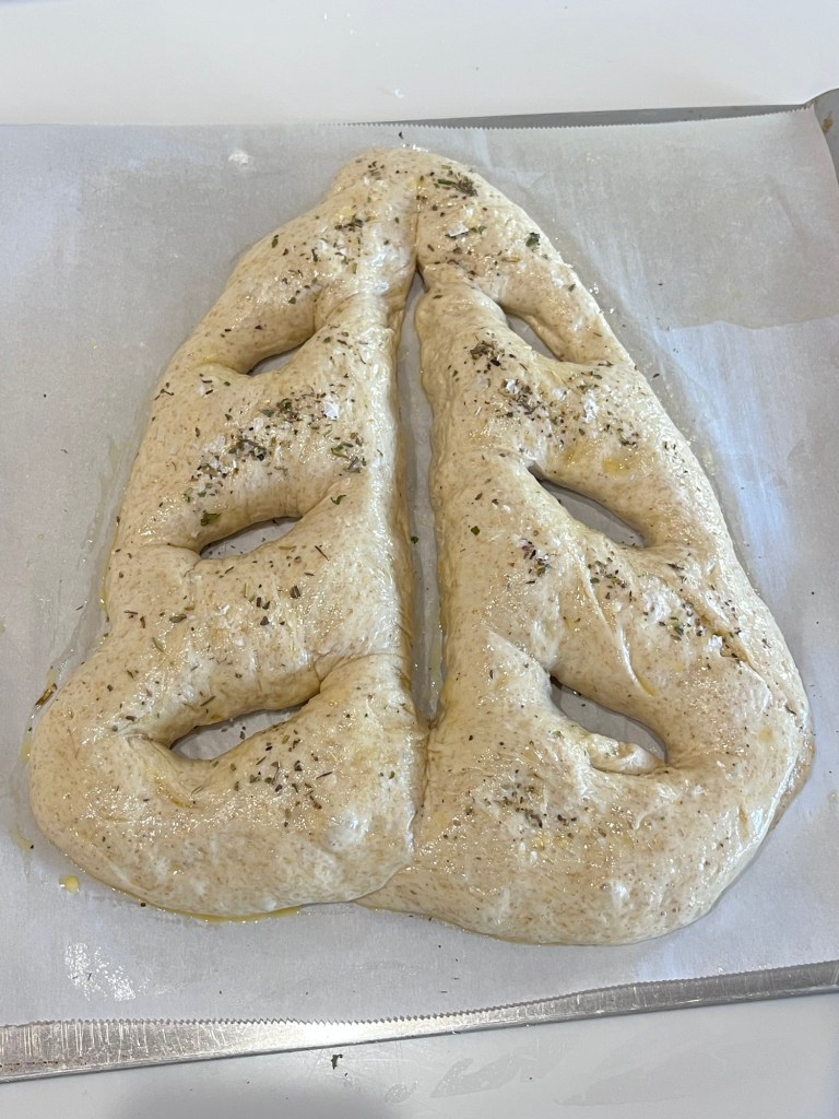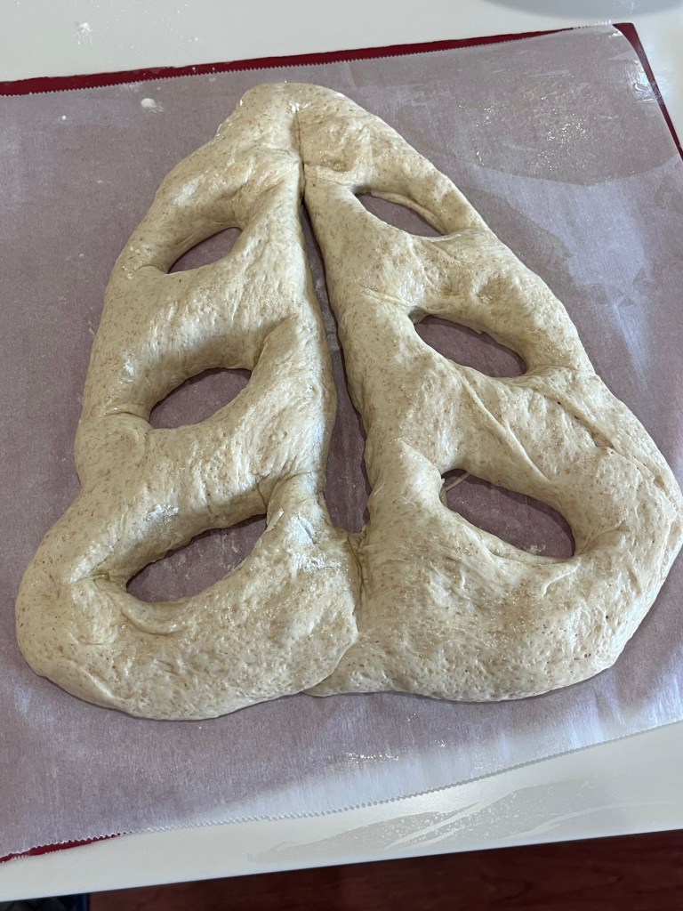 A new month, a new challenge, a new bread. I had not made Fougasse before this challenge, Fougasse is the french version of Italy’s focaccia bread. Its crust cracks when you bite it and the extra holes in the bread provide more crunchy crust.