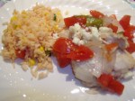 Rice: Cut corn from a fresh ear and saute in a little butter and EVO until tender. Boil about 3/4th’s cup of water with 3-4oz of tomato juice. Remove from heat, add rice, corn and a little cut cilantro. Let the rice soak up the liquid and fluff with a fork.