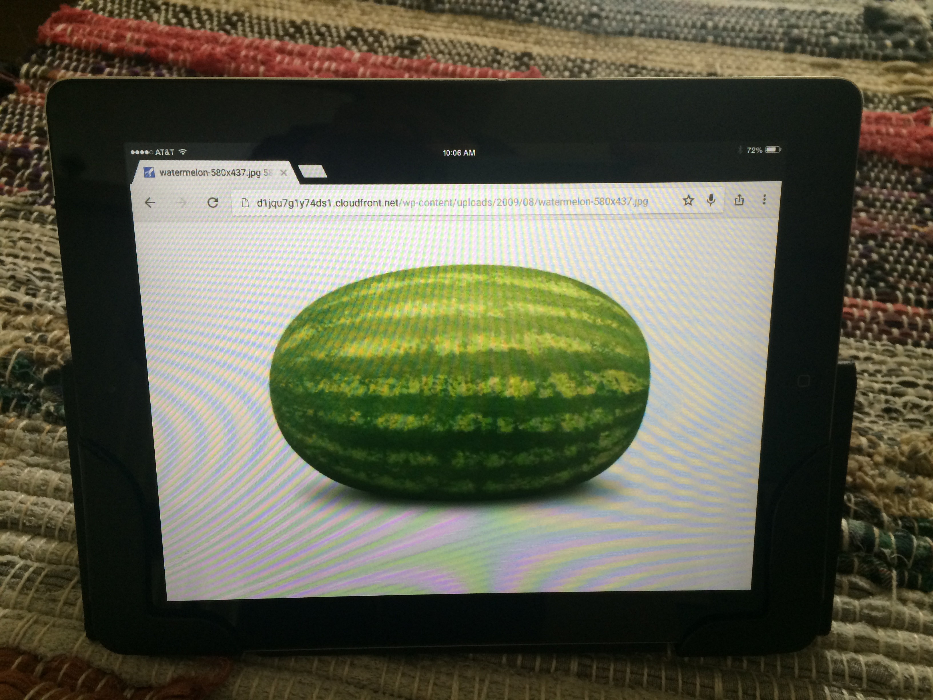 Remove the smooth light green frosted cake from the freezer and paint the dark green stripes. I used Duff green airbrush dye and a 3/8″ brush (because I own them.) If you are the artistic type with a good eye and imagination this is no biggie. If you are the more analytical, fallen chemist type, set your iPad with a picture of a watermelon next to your cake and copy to the best of your limited artistic ability.