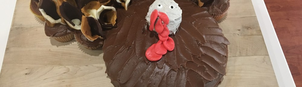 Frost the chocolate cake using a spatula to make feathers across the top. Array 18 chocolate frosted cupcakes (I used white cake for variety for the guests) around the frosted chocolate cake. Place the feathers on the cupcakes and add a few to the front side of the turkey body.