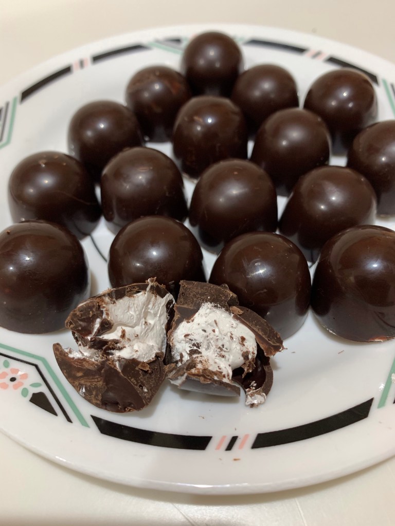 At this point there was barely enough tempered chocolate to fill and seal the new mold to make one more batch. I now have peppermint and previously made vanilla and raspberry. I also confess (#2) what I never tried, but wanted to, was chocolate coated marshmallow creams. While “fluff” is very sweet, the bittersweet chocolate provides a nice balance, plus I have only made marshmallow at home once before and I like to practice. Unfortunately, I only needed a few ounces and the recipe I have makes almost 2 pints, most of which is now sealed and sitting on the counter.