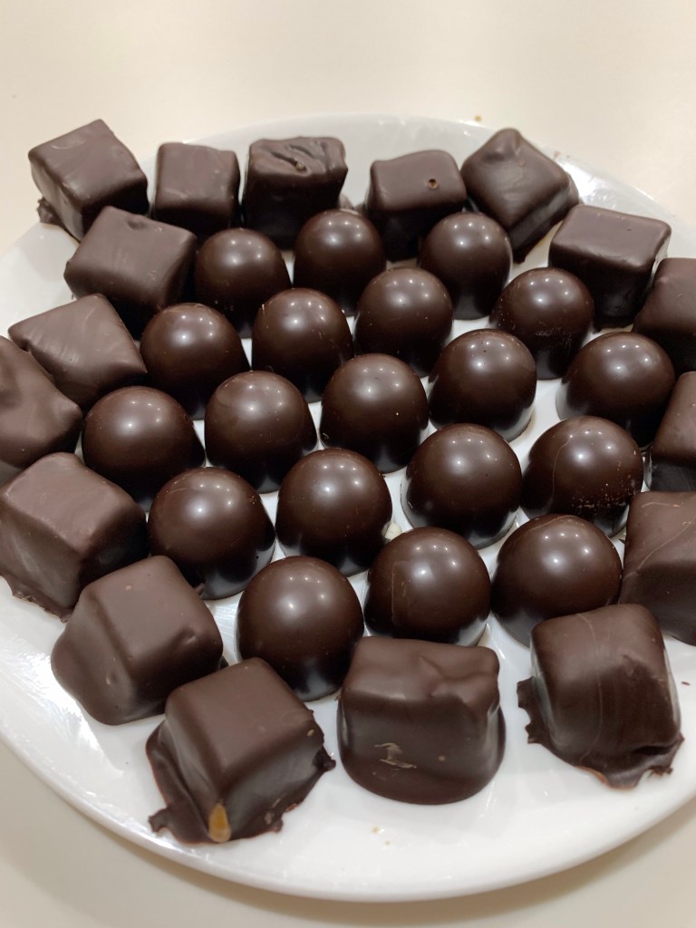 Unfortunately, there was too much tempered chocolate left over, but with my lucky streak intact I had some extra caramel from another batch of candies I made a couple of weeks ago. I dipped 20 caramel cubes in the remaining chocolate and set them aside to cure.