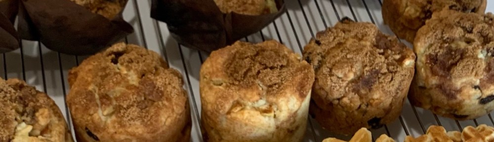 While the oven was hot I also made a batch of apple/raisin ‘scones’. Scones are in quotes as they are un-traditional. I made them in an ring mold pan to force them to rise up the sides rather than spread horizontally. (They did.) The same brown sugar and cinnamon crumble was used on both the scones and muffins. It was a good experiment, but I prefer my standard, traditional drop berry scones topped with sparkling sugar.