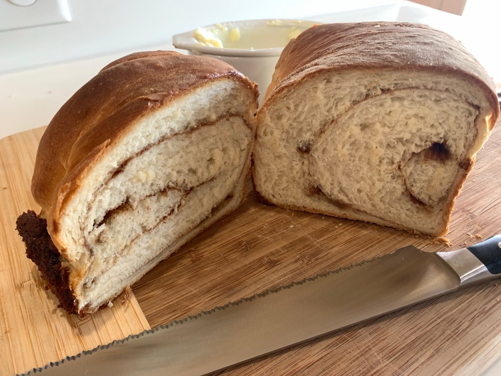 I saw a picture of a loaf of cinnamon swirl bread online and that was it. I knew I would make it. It’s an enriched bread dough, stretched into a long rectangle, filled, and rolled up to make a swirl. It doesn’t require kneading, which is nice, although my Kitchen-aid mixer doesn’t really mind.