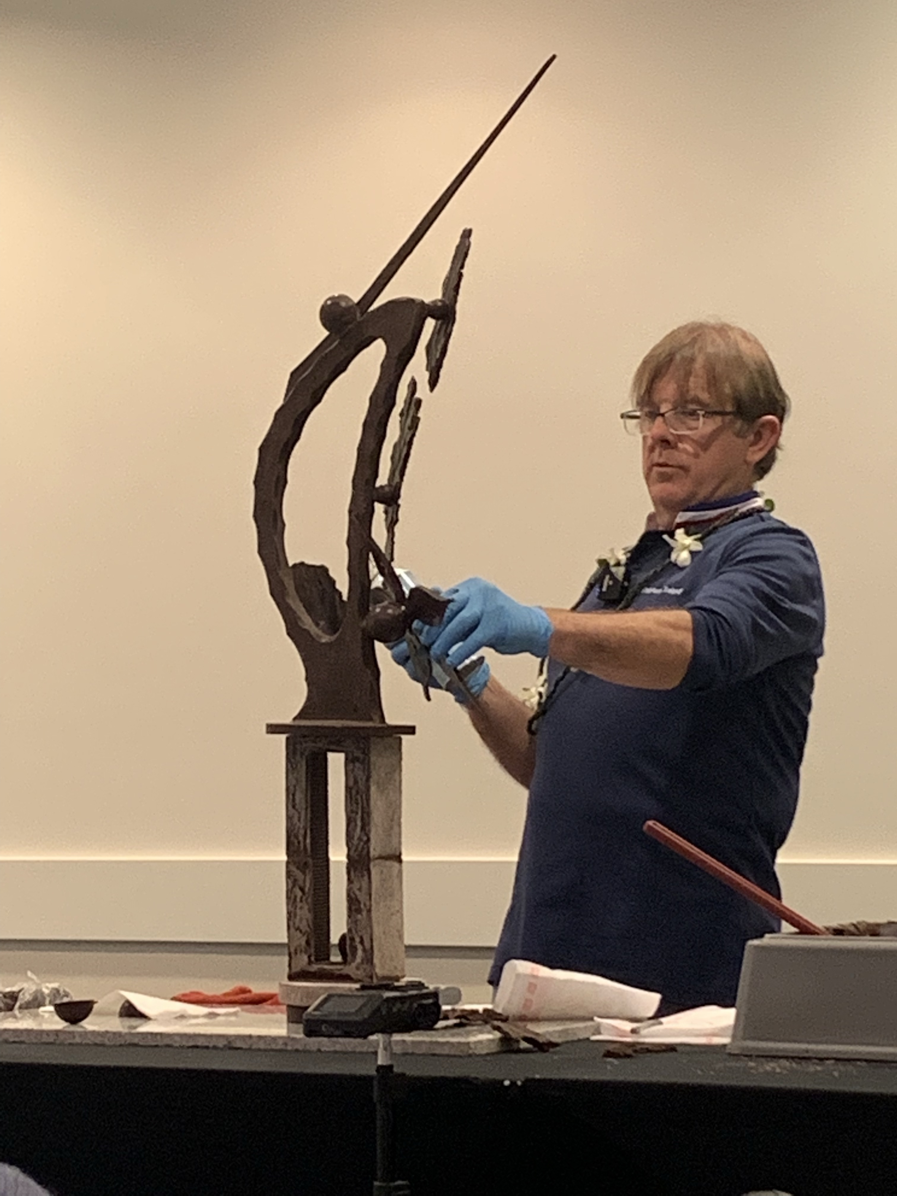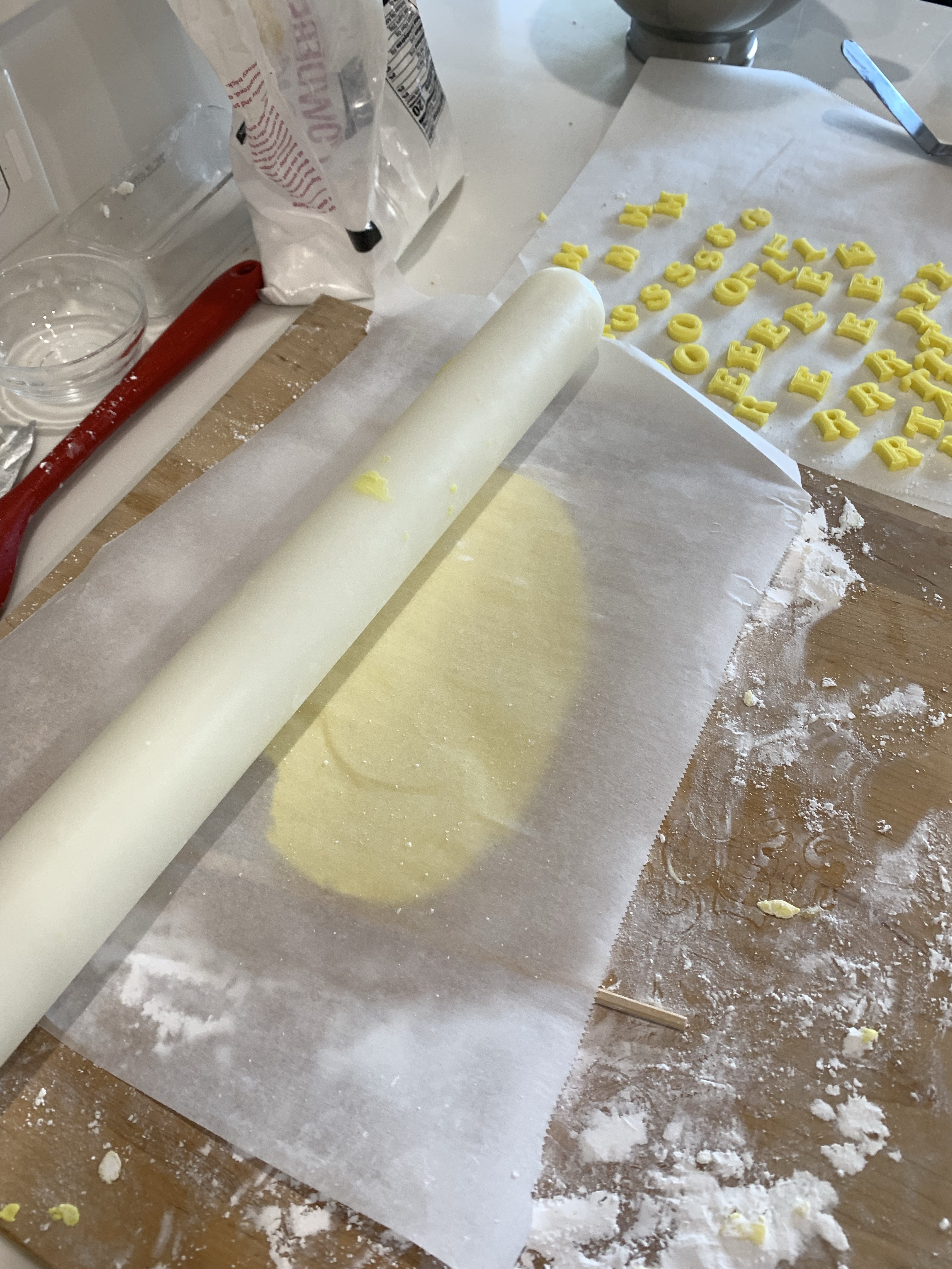 One batch of marshmallow fondant was divided 4:1. The large portion formed the edges and were striated to resemble pages of a book. The small portion was colored with the school color “yellow.” The white fondant was wrapped in plastic and left to rest for a couple of hours. The yellow portion was rolled out between parchment paper sheets. I use chopsticks of various sizes to roll the fondant into the desired thickness. The yellow fondant sheet was left to dry slightly, uncovered on a thin bed of powered sugar. After an hour or so, brush some additional sugar on the top of the sheet and flip it over, letting it rest until dry to the touch. I used the yellow to make the letters for the title and spline. (See the top of the pictures below. If they are dry, they are easier to punch out.