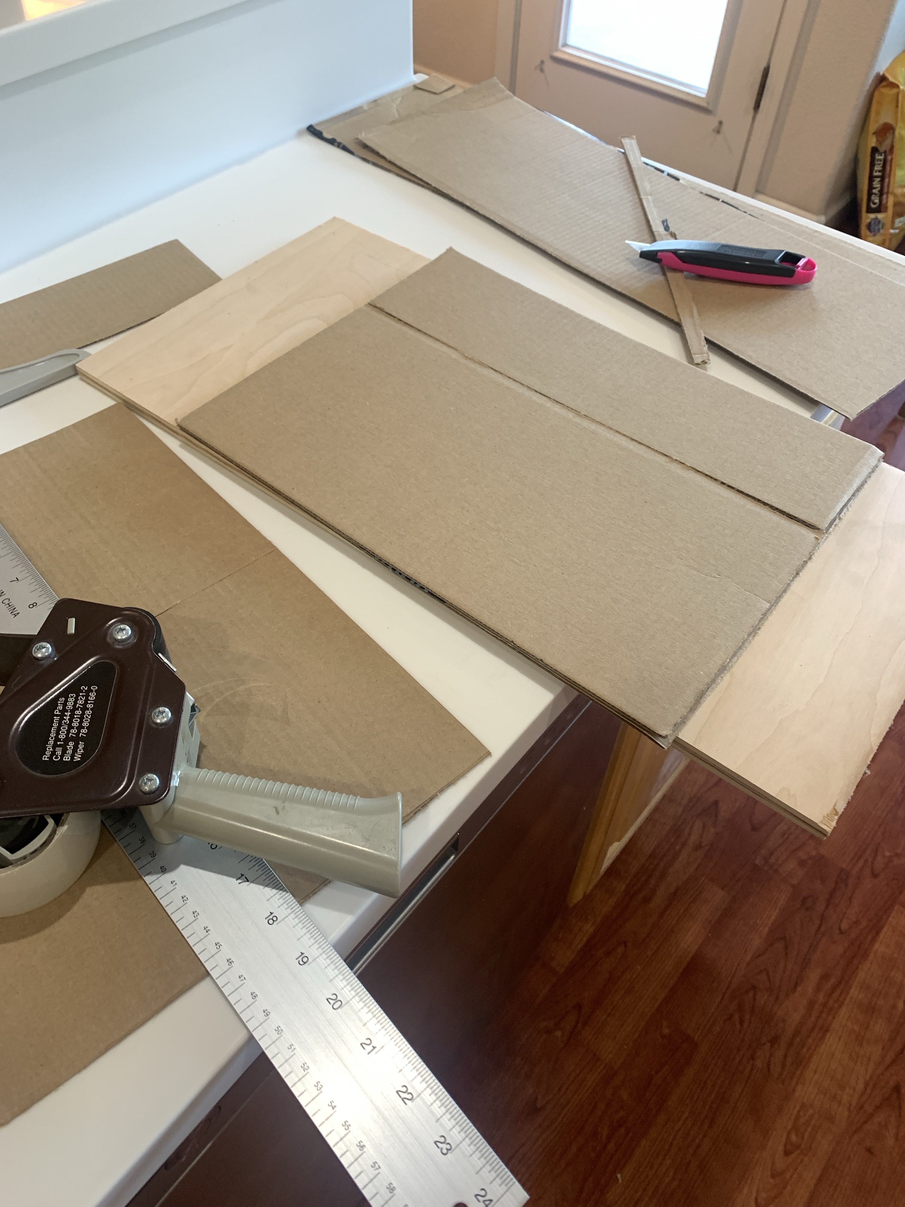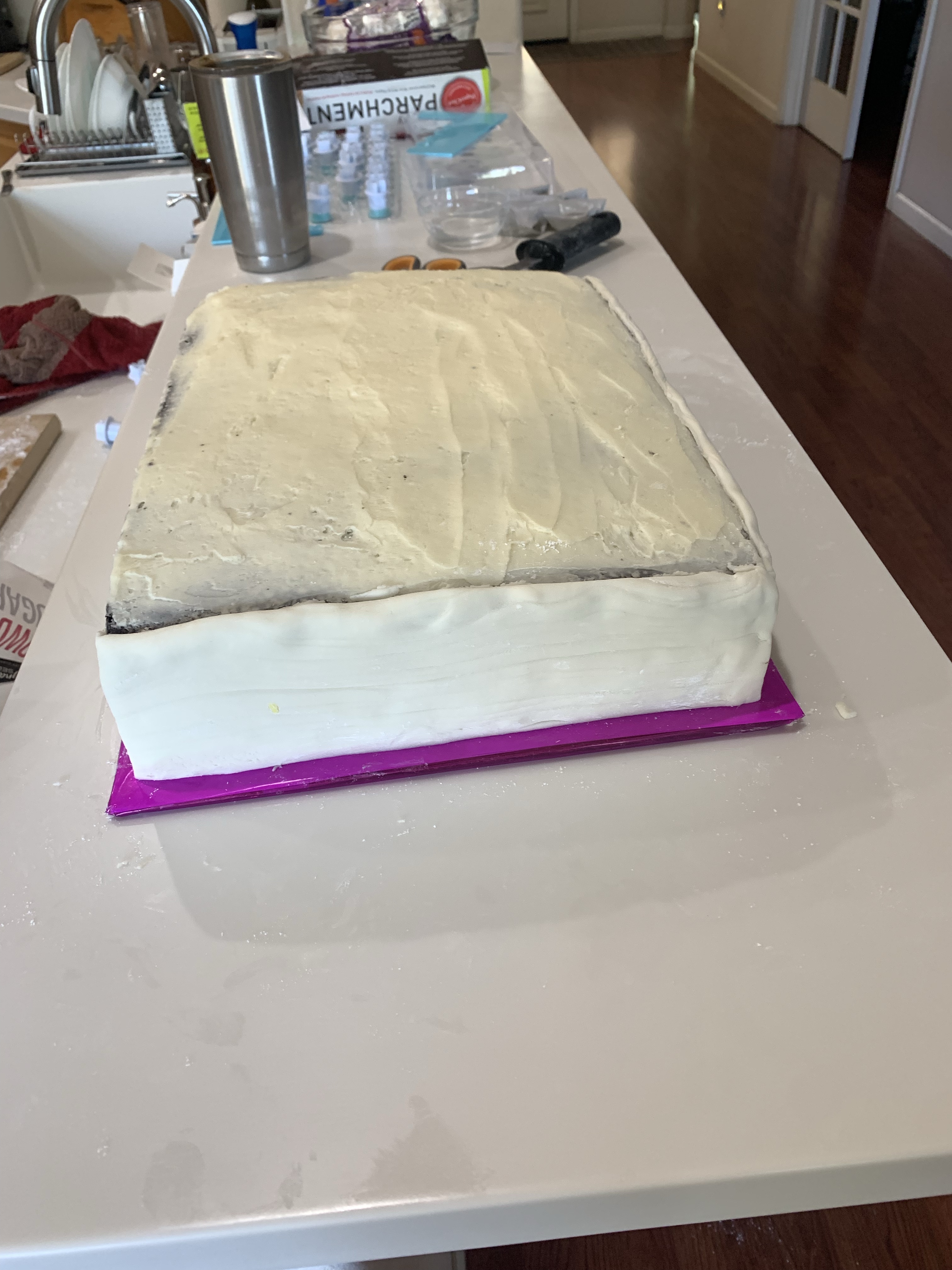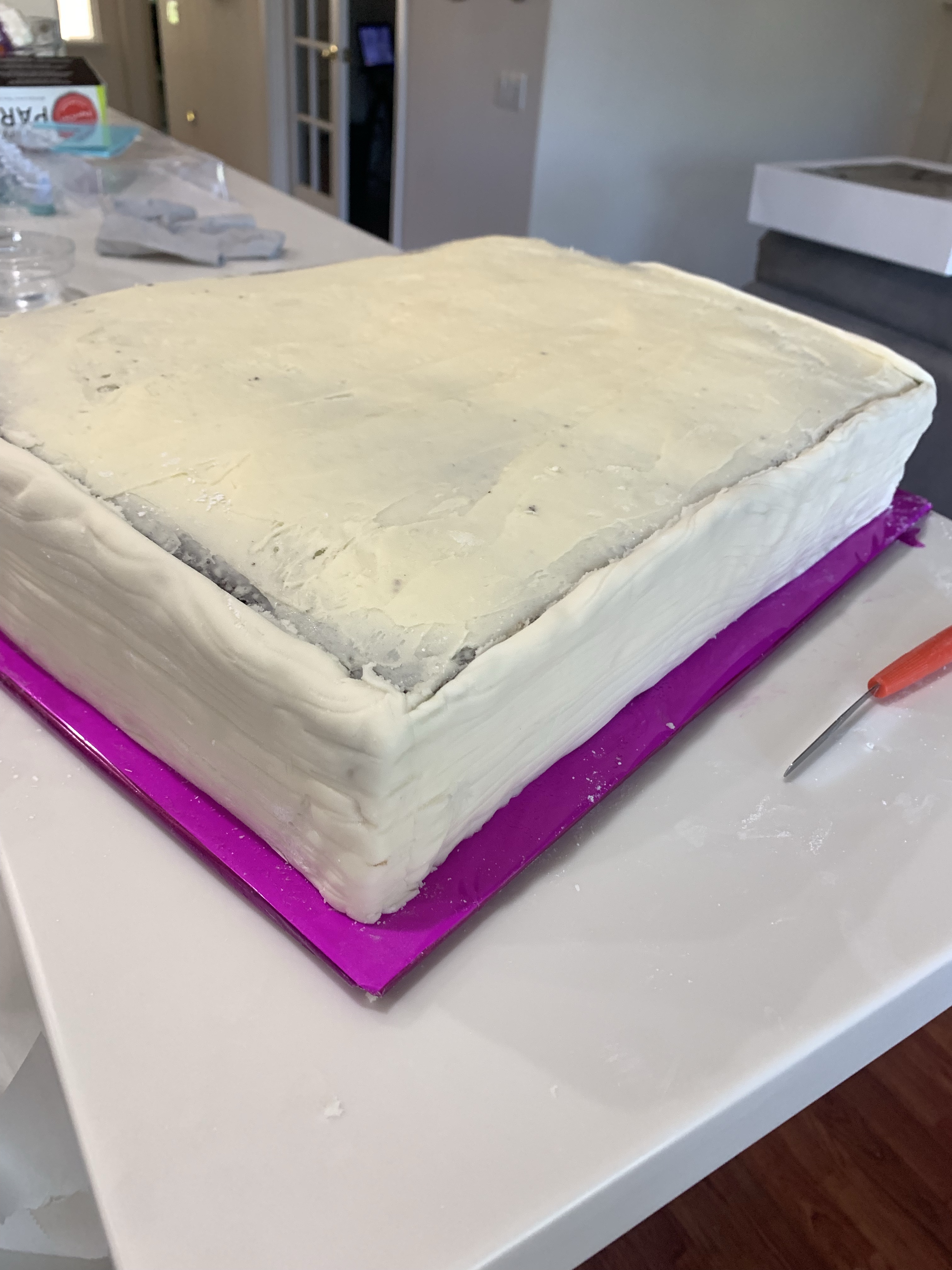 I didn’t have a rectangular cake board of the appropriate size (13”x17”,) nor did the local stores, so I made one from cardboard and food quality cellophane.