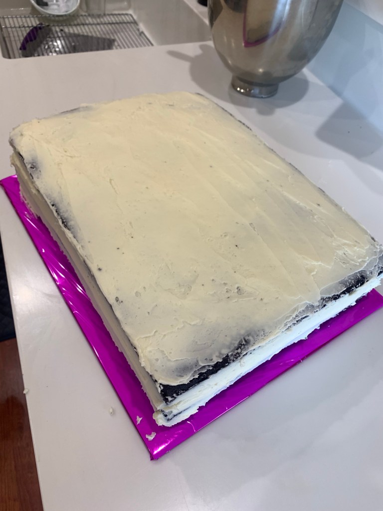I made two 11×15” Extreme Chocolate Cakes and refrigerated them for a couple of days. When crumb coating, I like to cool (and firm) the cakes. Also, I make my buttercream frosting a little thinner when using it for crumb coating..