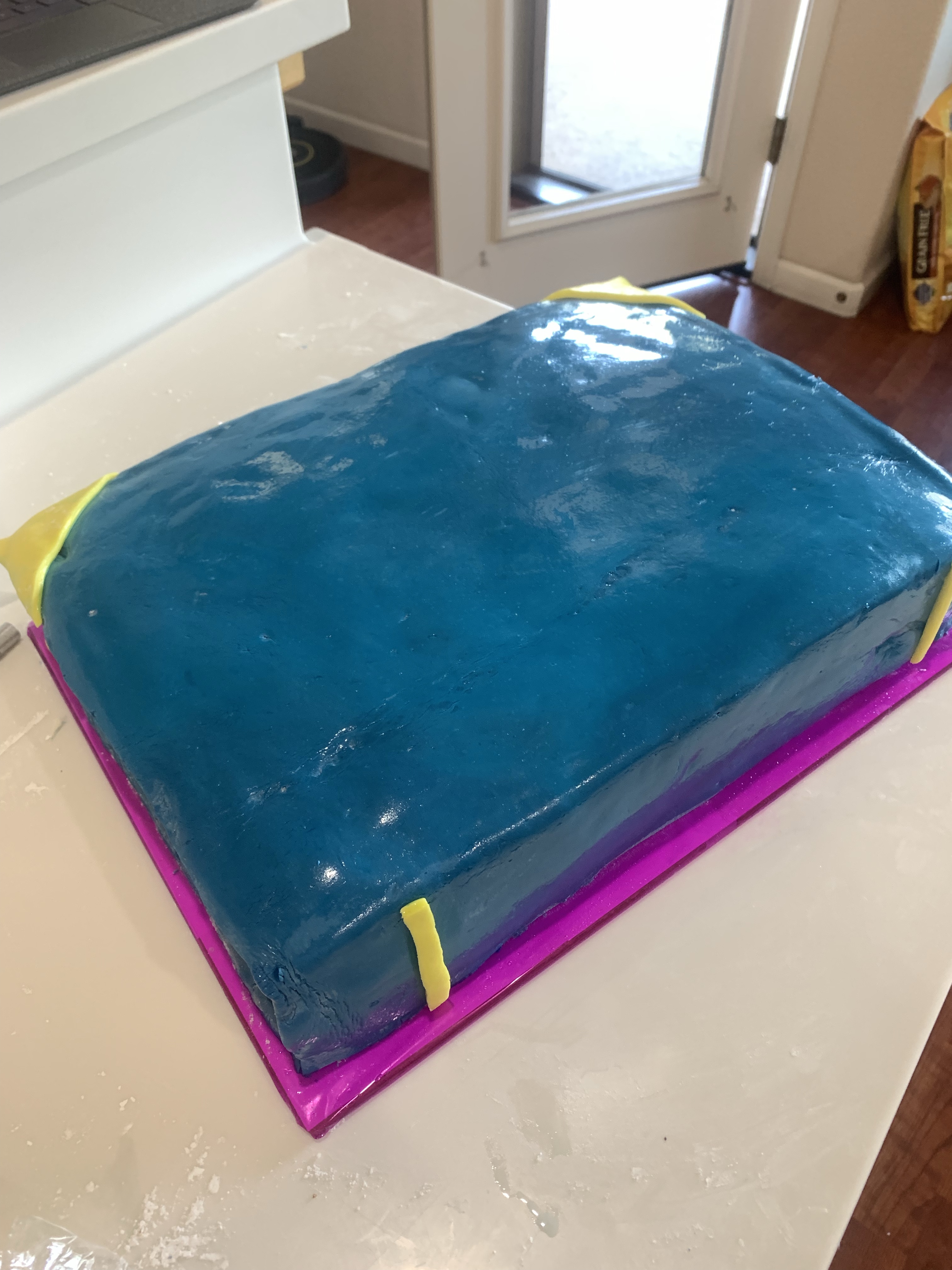 Make another batch of fondant. (Note to self: be sure to use fresh, mini-marshmallows. Life will be much easier.) This batch will be the book cover and can be colored “school blue” in the mixer. Once the consistency and color is correct, transfer the fondant to a vegetable-shortening-coated-surface and knead the fondant with gloved and grease covered hands to be sure the fondant is a uniform consistency and color. Let it set for an an hour, wrapped in plastic.