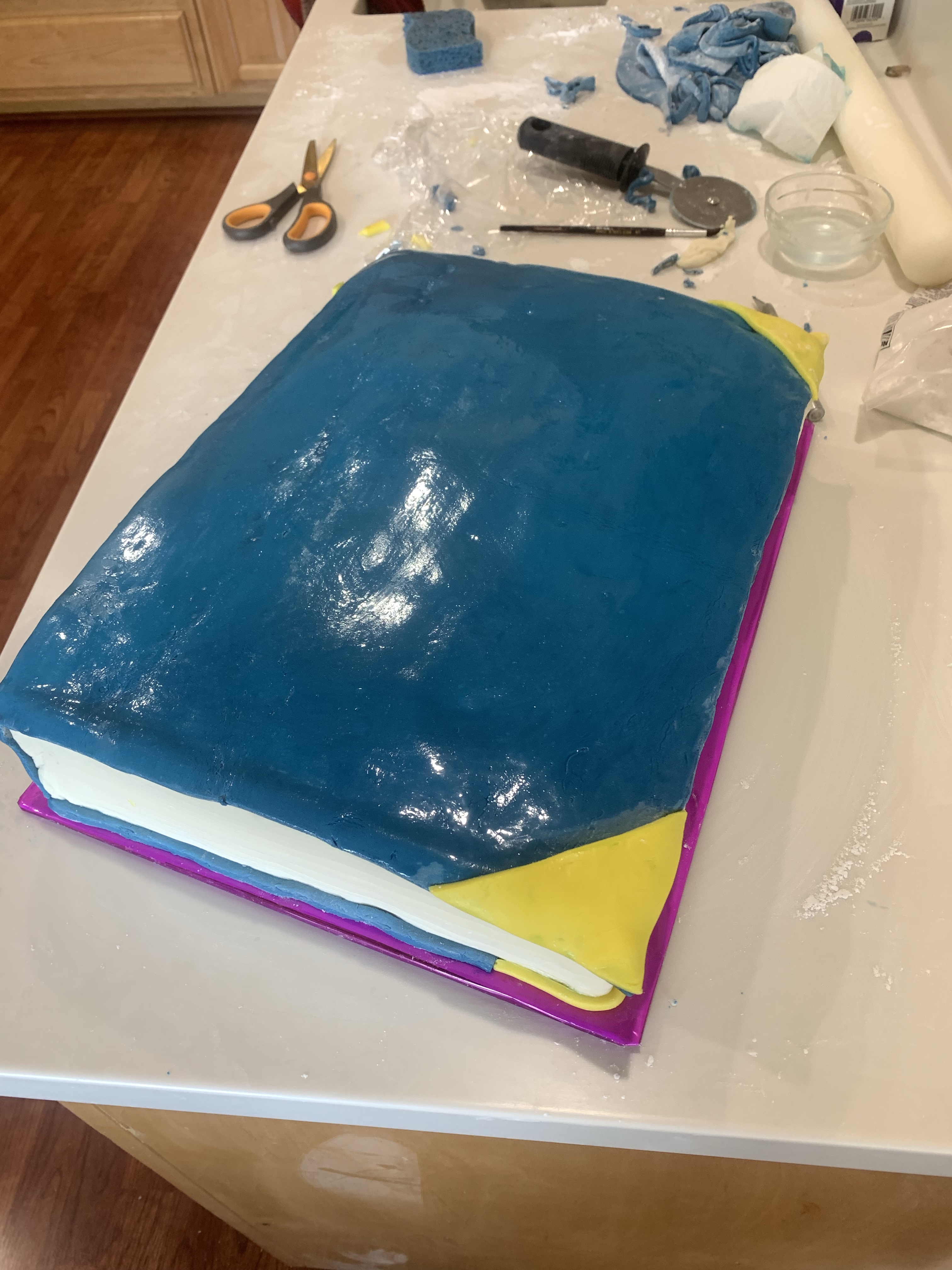 Roll the fondant out on a well sugar dusted table to be two inches wider and longer than the book. In my case it was 16”x16” and I used a 1/4” chopstick to roll it an even thickness. Fold it in half and carefully transfer to the cake. Trim to size and cut thin long pieces to be the bottom cover of the book. Paint water along the bottom edge and apply the thin pieces.