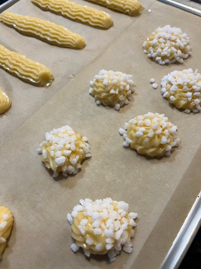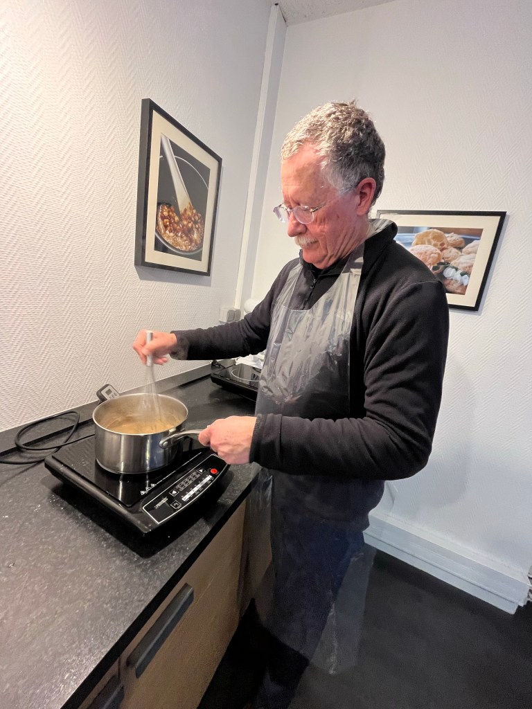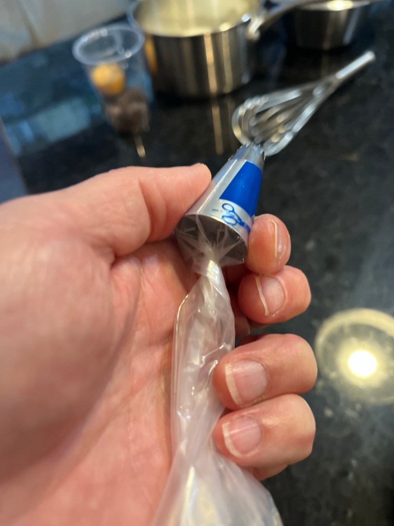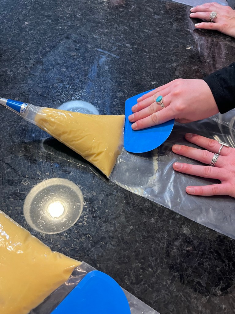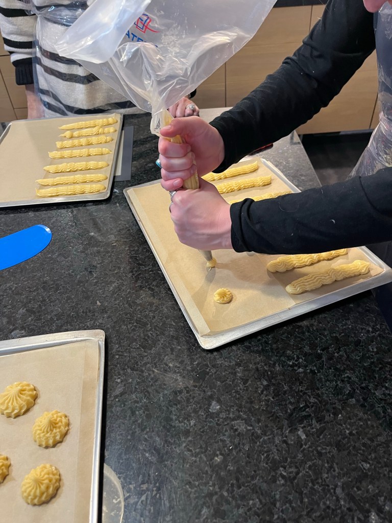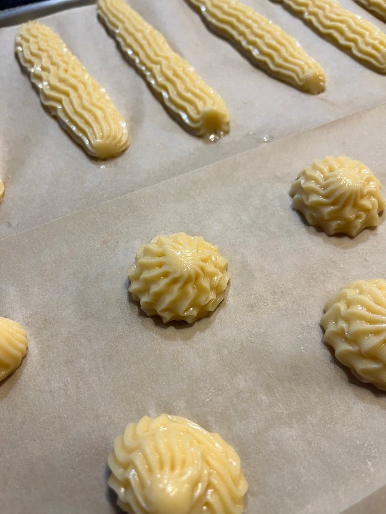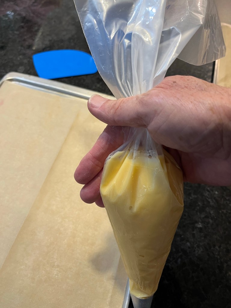 James set up three stations and we worked in teams of two. I worked with Mary, sister of Russ, both of Utah. You will occasionally see Mary’s hands and arms. You can tell us apart as I only wear one ring. We were both too busy to take pictures while we were filling the piping bags, also our hands were covered in raw choux.