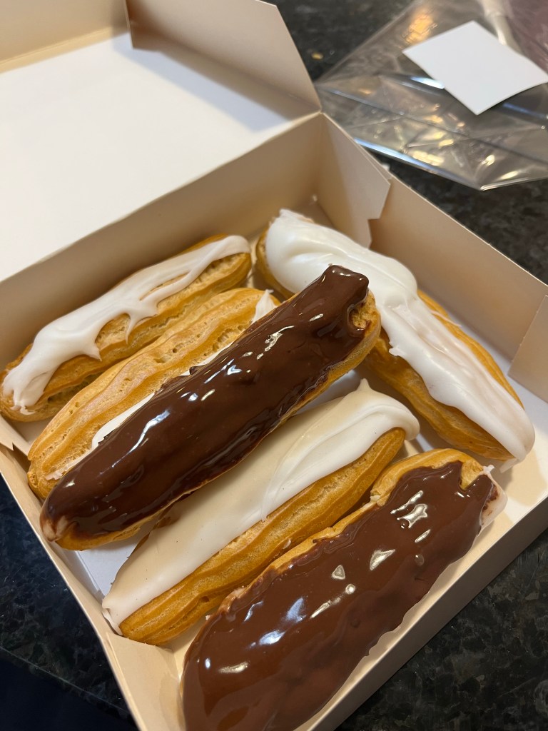 Two great tips for filling the eclairs, neither of which I knew. Use the tip of a knife to bore three holes in the bottom of each eclair. Let gravity be the force, do not push the knife down or you will break the eclair. Also, fill each end hole first. When you fill the center last the creampat will push up through the two end holes assuring the entire eclair is full. Believe me, this works great.