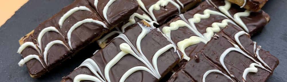 I used my bench knife to act as an end block, lined up six cookies and spread dark chocolate over them all. While the dark chocolate was still liquid I piped the white in thin (occasionally straight) lines and ran a tooth pick across the top of the cookie to make the feathering.