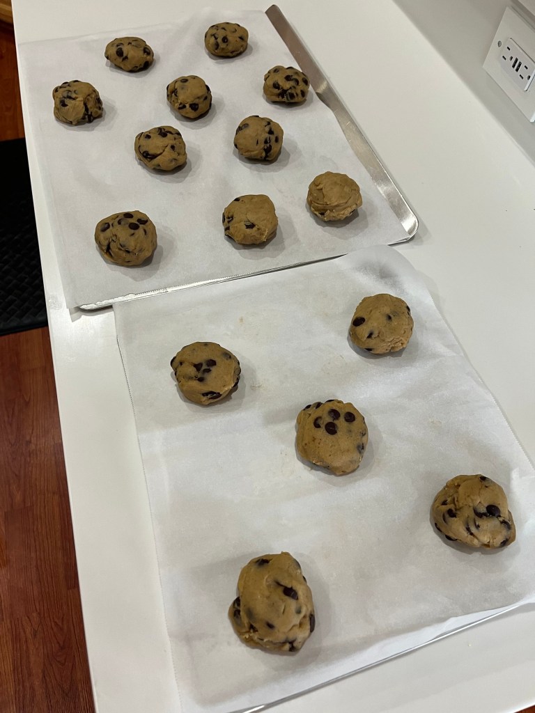 - Arrange the cookie dough balls on parchment-lined baking sheets, them 3″ to 4″ apart. (Five dough balls fit perfectly on a half-sheet pan. The 90g cookies can be arranged in a 2-1-2 pattern; the 50g cookies can be arranged in a slightly staggered 4 x 2 pattern.) For consistently shaped cookies, roll each piece of dough into a smooth ball before baking.