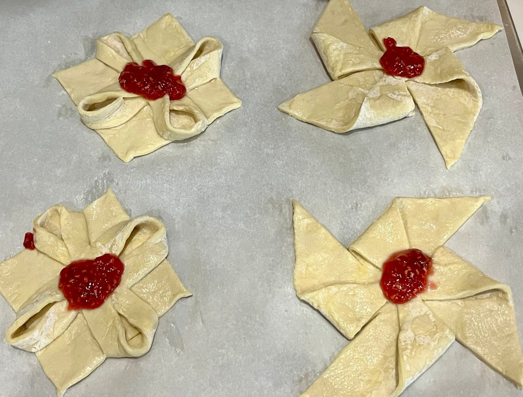 I don’t actually have a recipe for this so here it is in a nutshell: Cut the puff pastry in 4 squares. Fold a square in have to form a triangle and cut as necessary to make the desired design. Fold and pinch any overlaps to reduce the chance of separation.