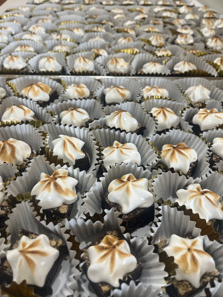 Our home association wine club had a beach themed wine tasting event and I provided the s’mores brownies for 164 guests and staff. With all humility, they were exceptional. I used my basic raspberry chocolate brownie recipe, but with the excellent suggestion by QC, added a layer of crushed graham cracker on the ganache and below the Italian meringue. I also blowtorched the meringue to give it the toasted s’more look.
