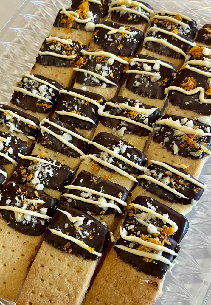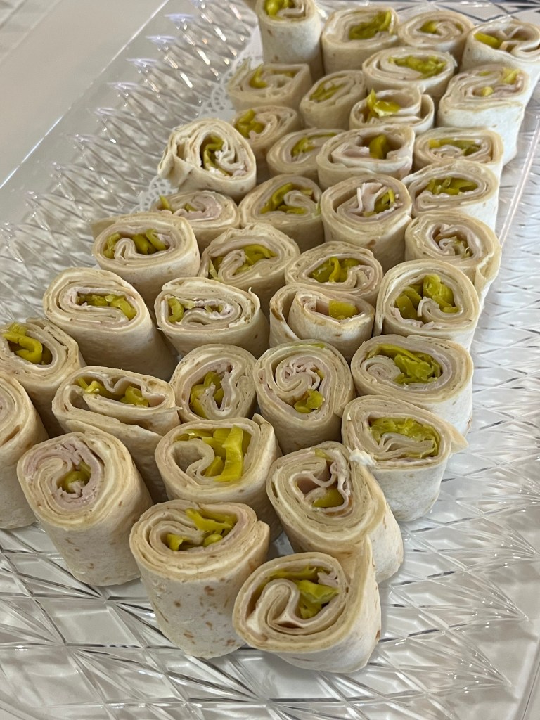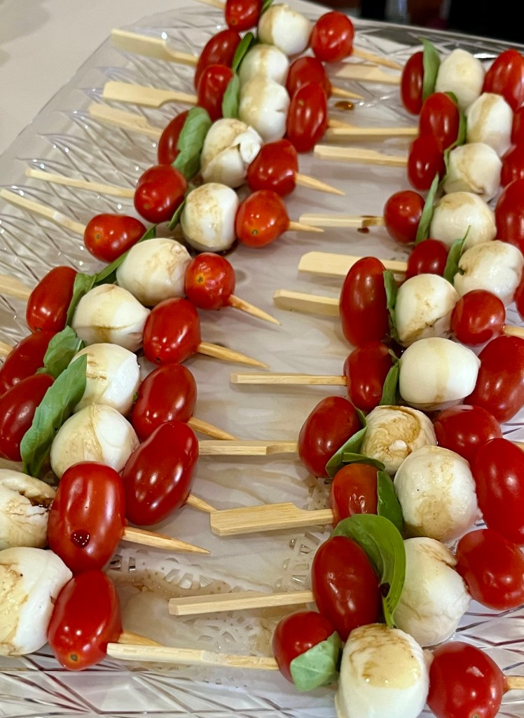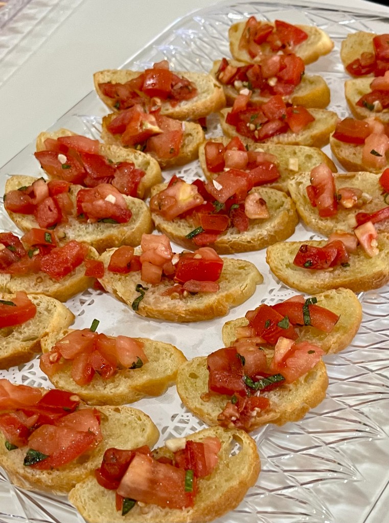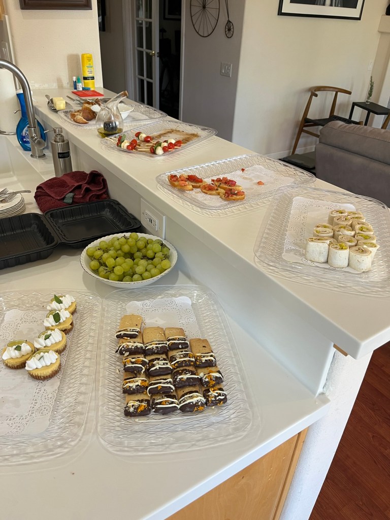 Pain de CristalPain de Cristal with oil and vinegar Turkey Peperocini wrapsBruschettaCaprese BitesOrange Flavored Shortbread Cookies with Chocolate and Crushed MacadamiasMini Key Lime PiesLots of Drinks with Ilayne’s Punch as the StarDecimated Offerings