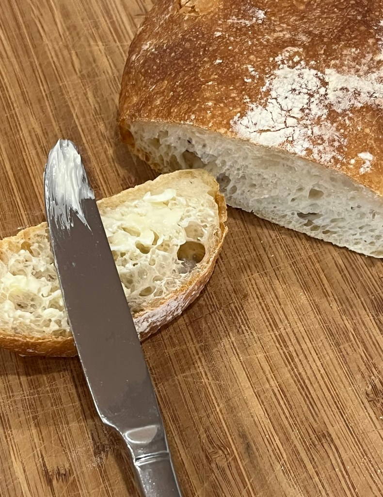 As gently as possible, turn the dough out onto a heavily floured surface, keeping the rectangle or square shape – be careful not to deflate the delicate dough. Sprinkle a generous amount of flour on top of the dough, leaving no exposed sticky spots. a. For four small loaves: Working as gently as possible, use a bench knife or other sharp knife to divide it into four pieces. Gently place two pieces on a piece of parchment, leaving space between them. b. For two long loaves: lay two pieces of parchment paper, overlapping 2”. Carefully divide the dough in half lengthwise. Using a bench knife carefully slide some flour under each loaf and shape into regular rectangles. As gently as possible slide the loaves onto separate pieces of parchment paper. (Elapsed time: 5 hours) c. Allow the loaves to rest at room temperature for 1 hour, uncovered until large bubbles appear on the sides and surface. While the loaves are resting, preheat the oven to 475°F with a baking stone on a lower rack. The loaves are ready for the oven when there are a few large bubbles on the surface of each loaf, and they feel light and airy. (Elapsed time: 6 hours)
