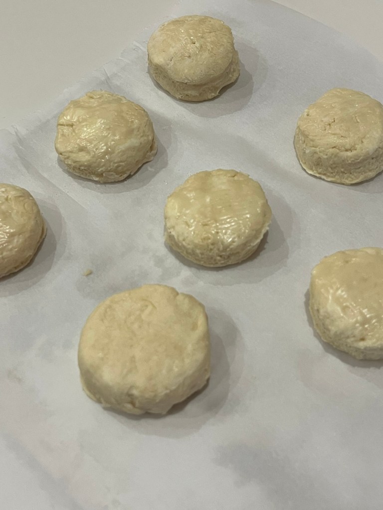 Cut into 1½ “ circles, spread some melted butter on it, place on parchment papered baking sheet, and chill in the freezer as oven pre-heats, ~15 min