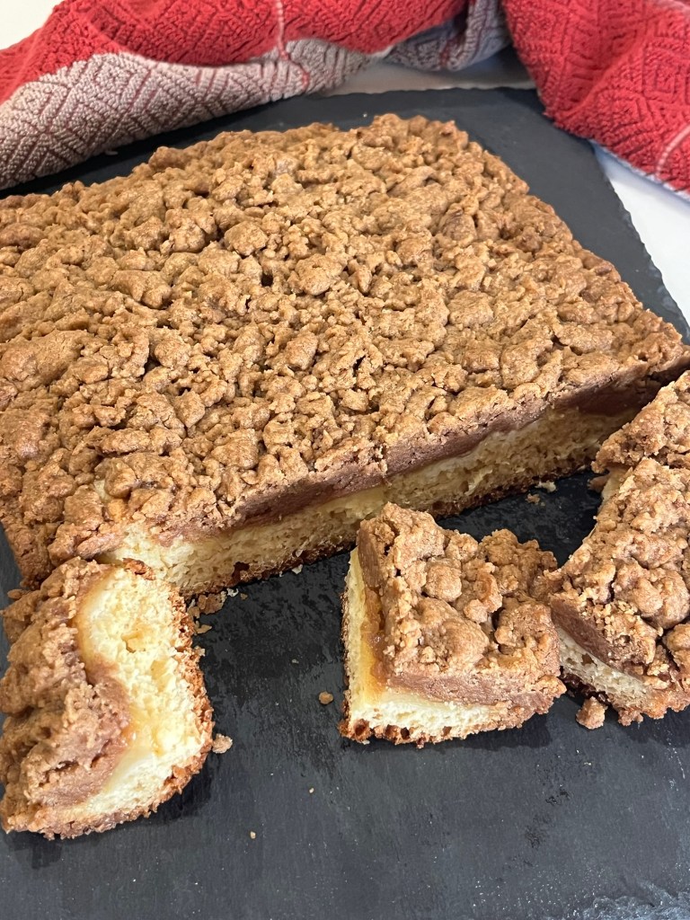 My neighbors, Donna and Alex (QC Cadre members,) gave me some huge peaches from their tree. I could barely finish the smallest so I decided to use two pounds of the rest to make Sally’s Fresh Peach Cobbler. Her recipe calls for about four pounds which would be baked in a 9”x13” dish, so I scaled it in half, used two pounds and used a 8”x8” dish. (I knew a full recipe would be too much for us to eat.)