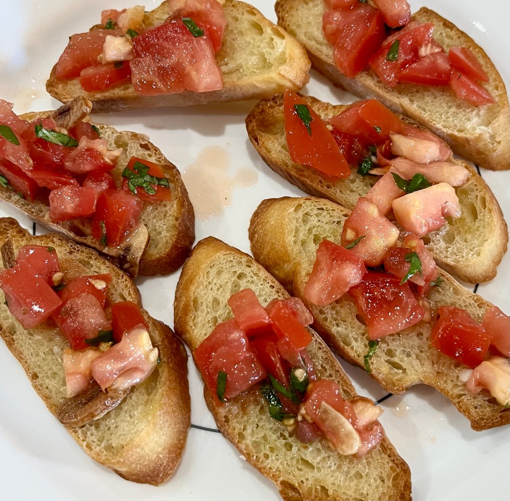 Daniels recipe: fresh basil and tomatoes, olive oil, salt, good quality balsamic, toasted baguette with olive oil, topped with fresh Parmesan