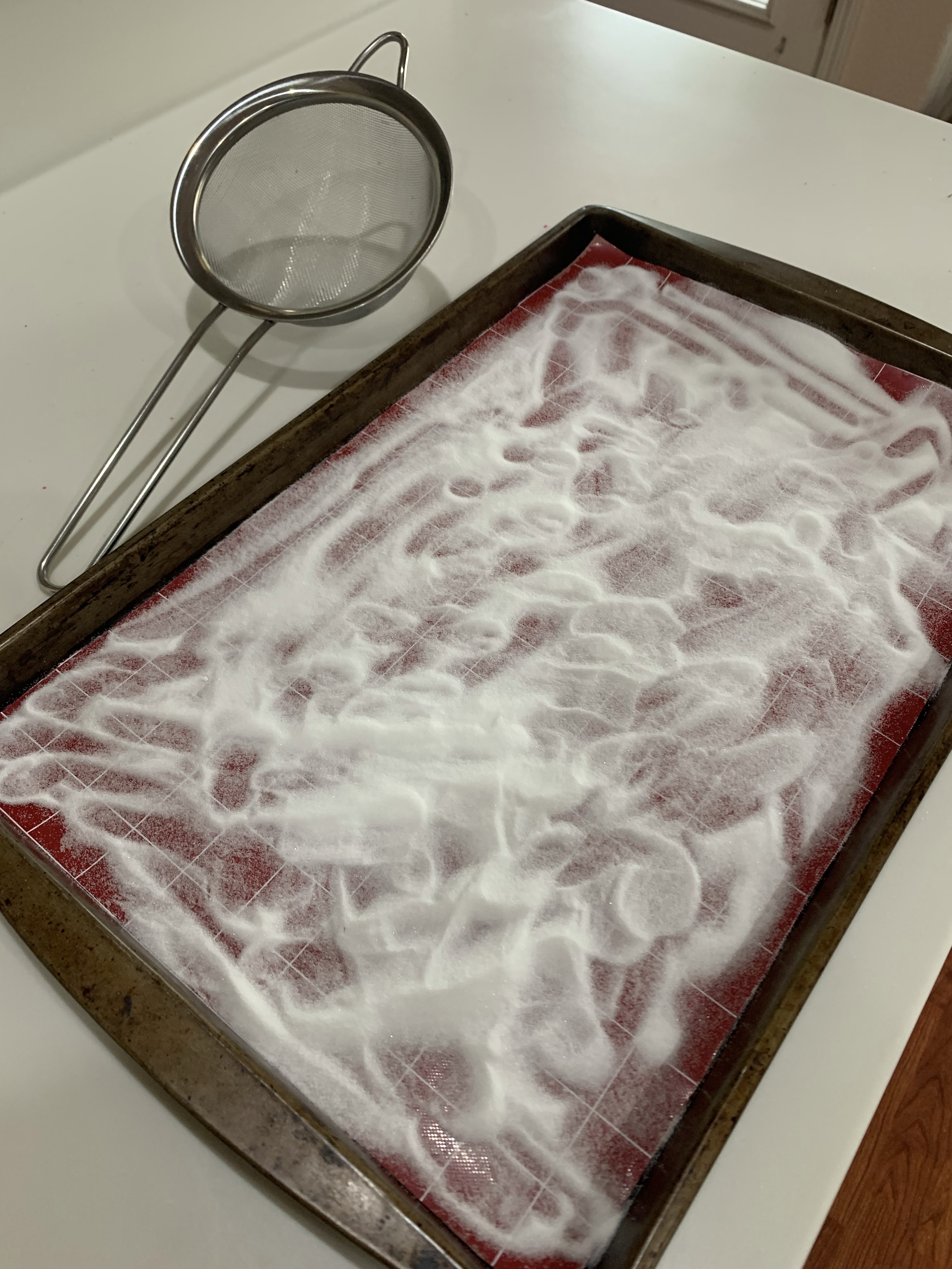 L: Making jam pretty much as normal – R: Caster sugar coated silicone lined baking sheet