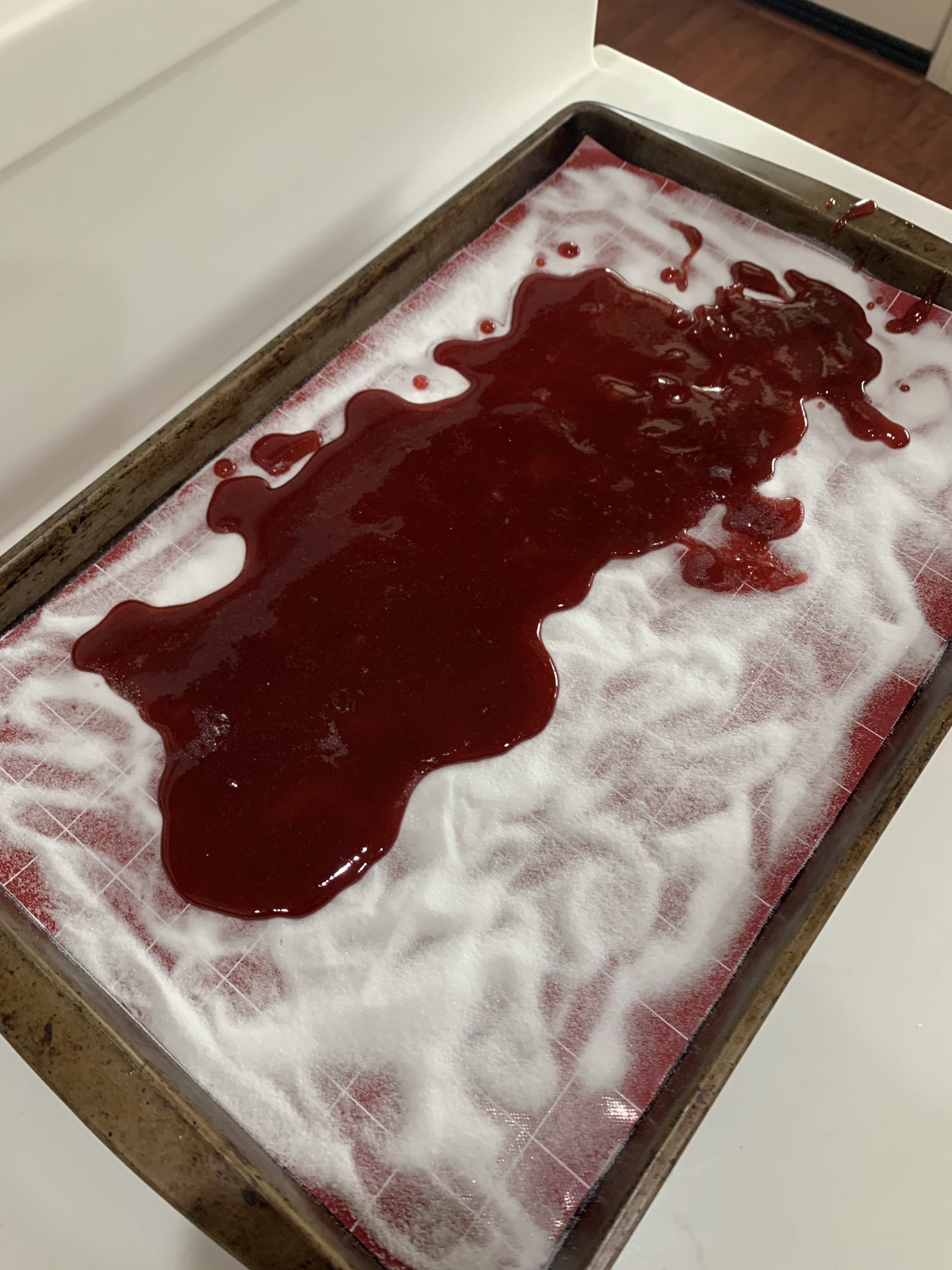 Pour mixture into a fine sieve to remove seeds. Press firmly to squeeze as much seedless puree as possible through the sieve. I let the drippings fall on the caster sugar coated silicone mat trying to keep the thickness to 1-2mm.
