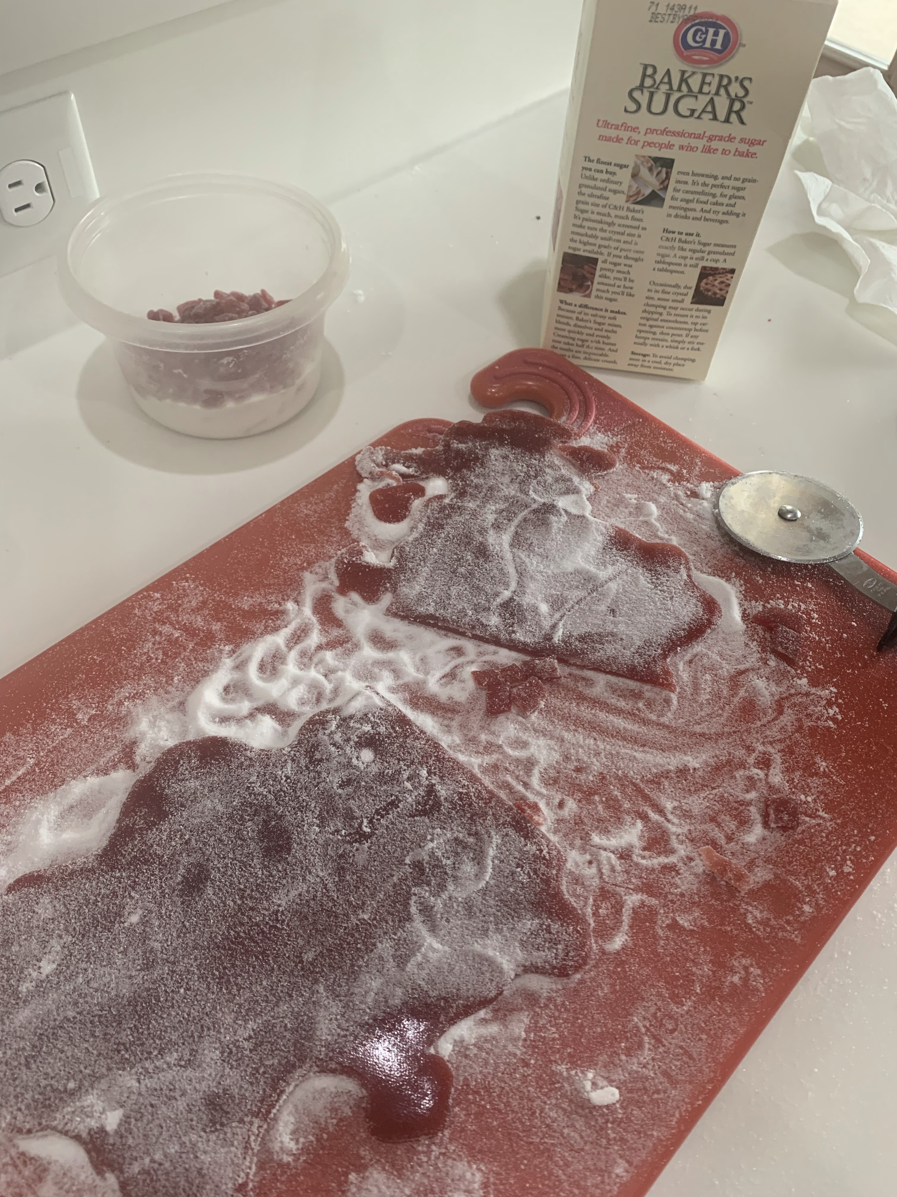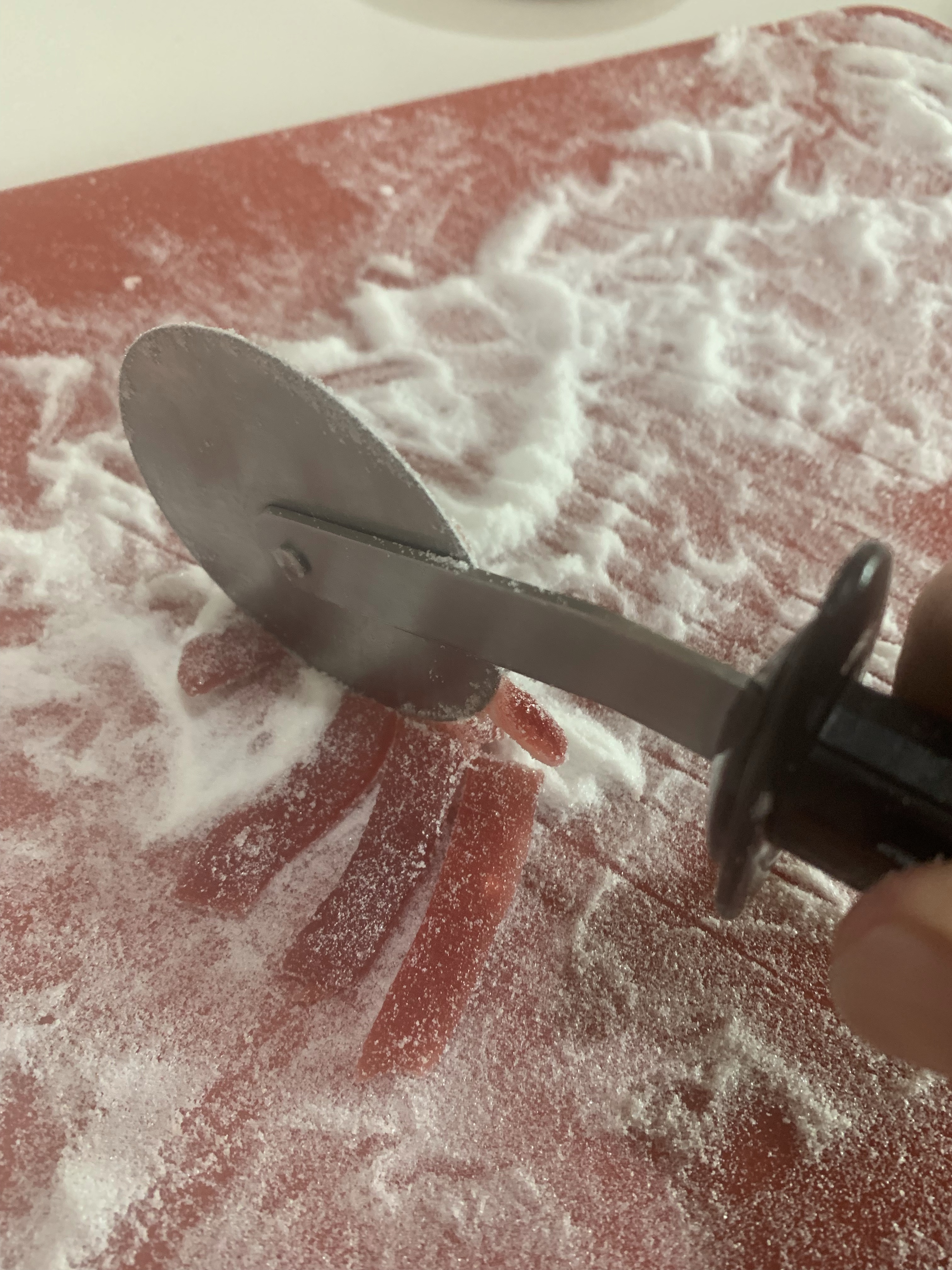When the fruit sheet is pliable cut into small squares (1/4” across) with a knife
