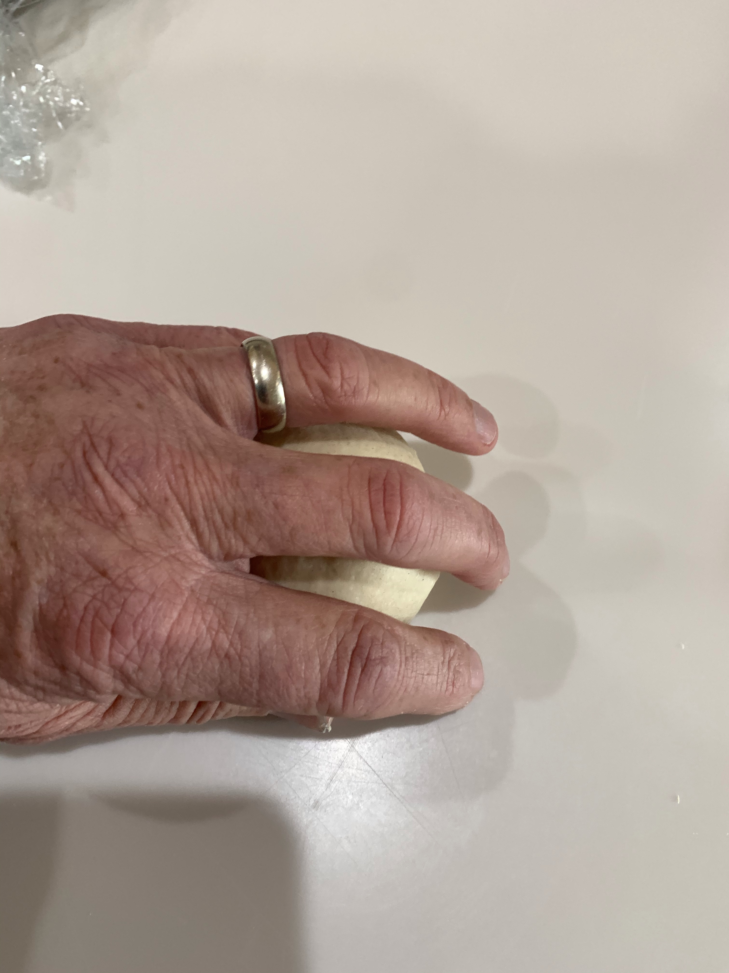 - First, form a dome. Make a circle with one hand, place a piece of portioned dough halfway inside it, and use one finger of your other hand to turn the dough while gradually pushing it through the circle tightening the dough as you work around the outside. You want to end up with a nice, taut dome.