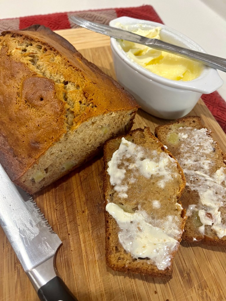 We returned from Kauai VERY early this morning. When I staggered into the kitchen I found three VERY ripe banana and a very (small case on purpose) soft apple in our produce rack. Instantly, I thought apple-banana bread.