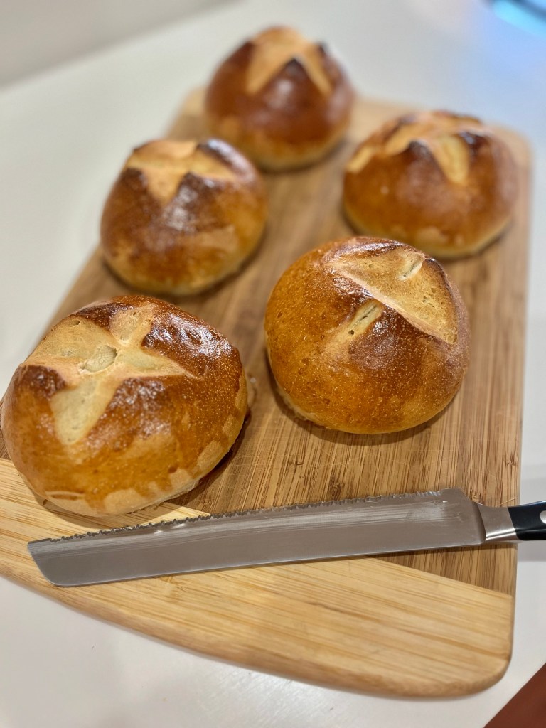 The dough weighs ~1380 g or ~230g once divided and the final loaf size is ~5”. I used an egg-yolk and milk wash for this bake. It results in a slightly darker crust than a whole egg and water wash. Use whichever you like, they will all be good.