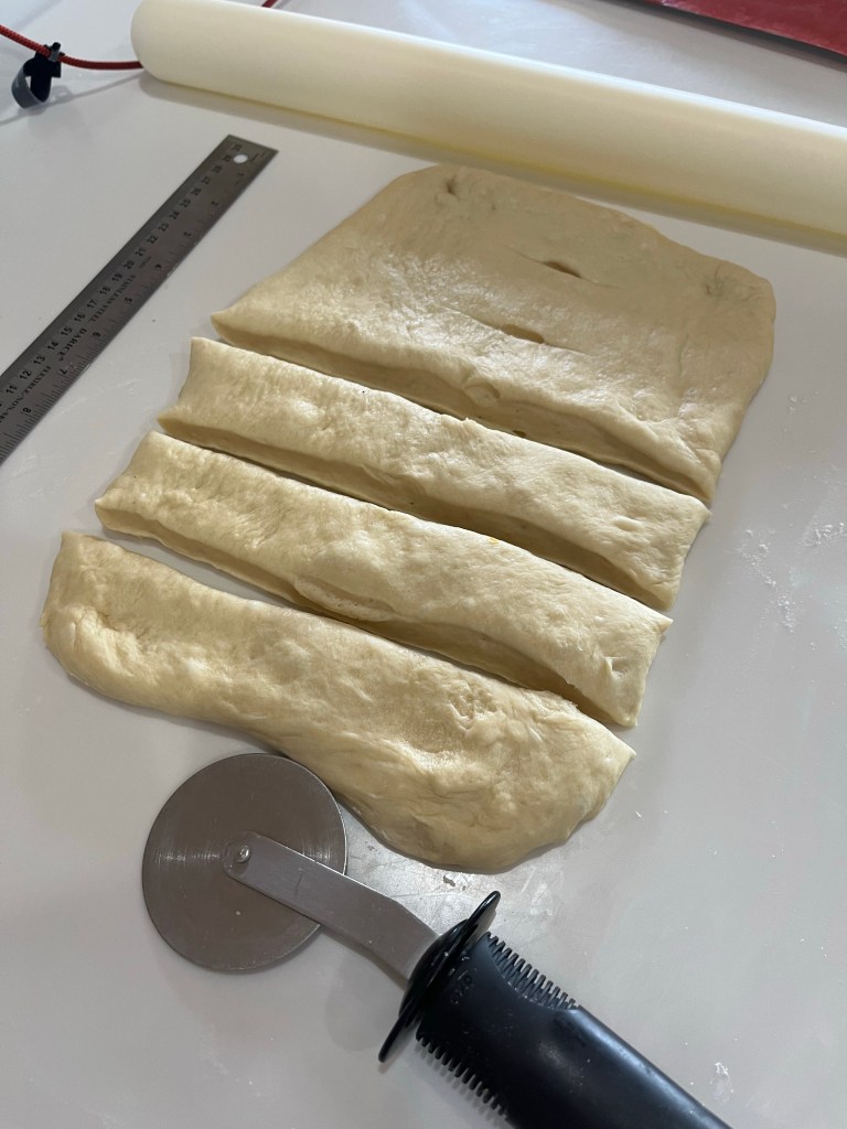 - Cut the dough into even pieces using a pizza cutter so you have 24 pieces of dough. It’s optional to roll the squares into spheres if you like.