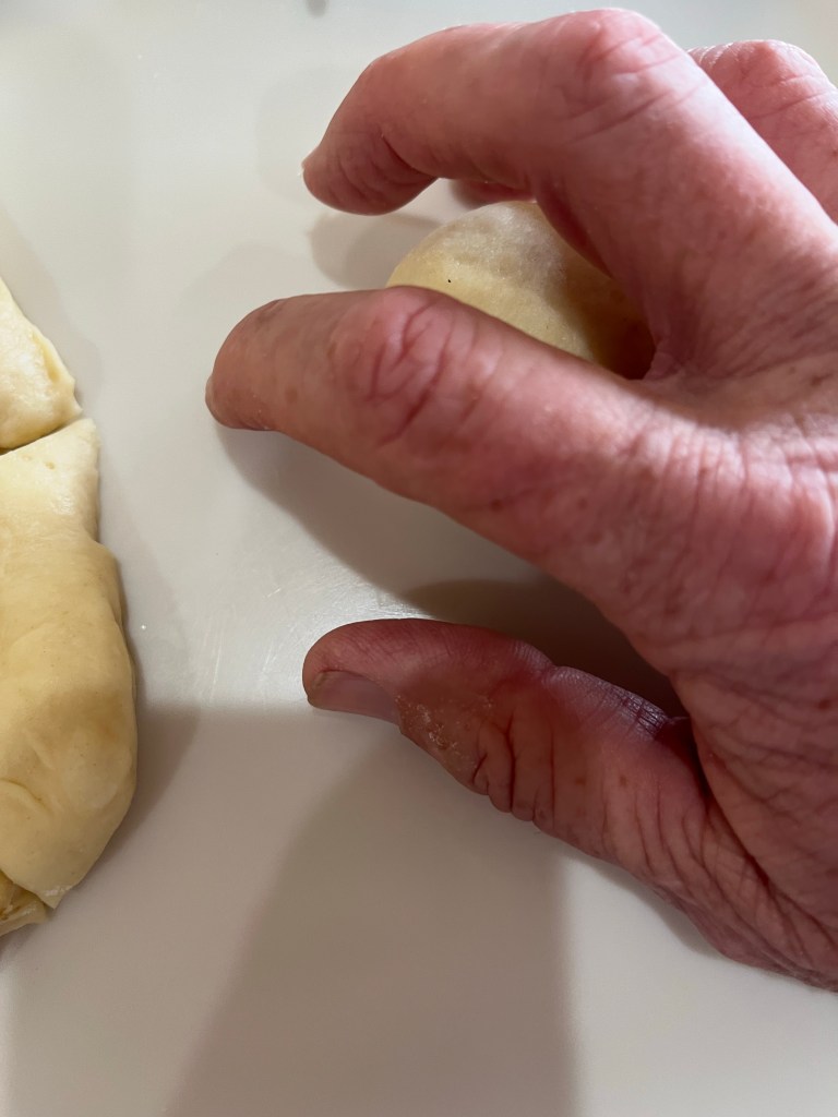 In a compromise I rolled the dough into a rectangle, 12” x 8”, and cut it into 24 pieces (6×4). I then rolled each into a sphere using the same technique I used to make dinner rolls. (Place the roll on a barely floured surface, cup you hand over it and roll in a circulate motion until it forms a nice ball and there are no creases.