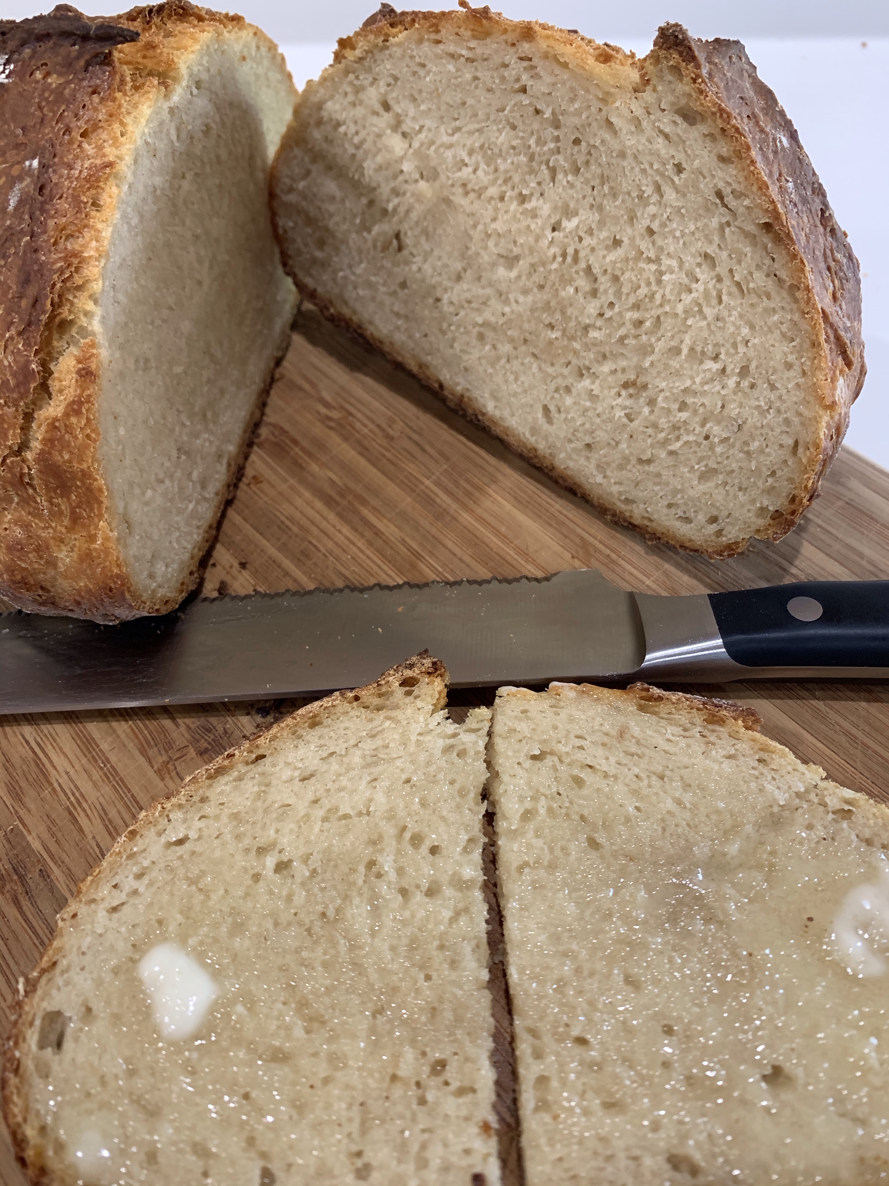 - Carefully remove the damp cloth, then slash the dough 3 times across the top with a very sharp knife or razor blade about ¾ of an inch deep. Immediately place in a pre-heated 375o oven, and place a pan of boiling water on the oven’s bottom. Remove the pan after 10 minutes, this will create steam and help with crust development. Continue to bake for 30 minutes or until center is 180 degrees F.