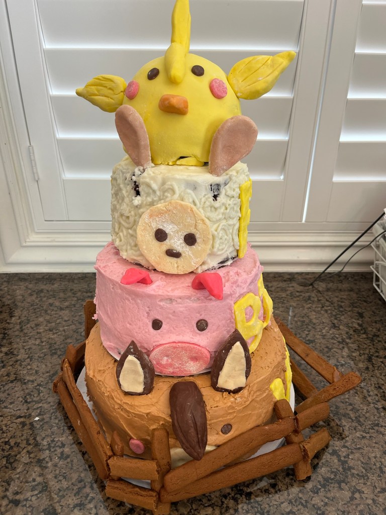 It’s not every day you are able to make a “Farm Animal” birthday cake for your granddaughter’s 6th birthday! I made a horse, a pig, a sheep and a chick and surrounded them with a barnyard fence.