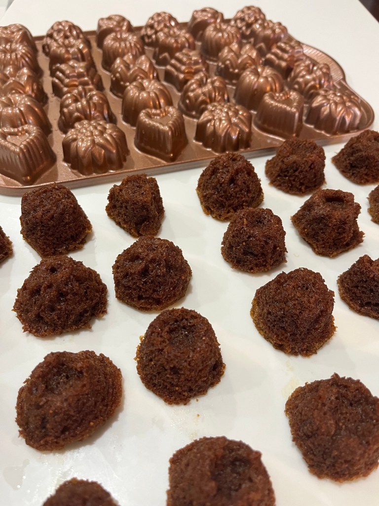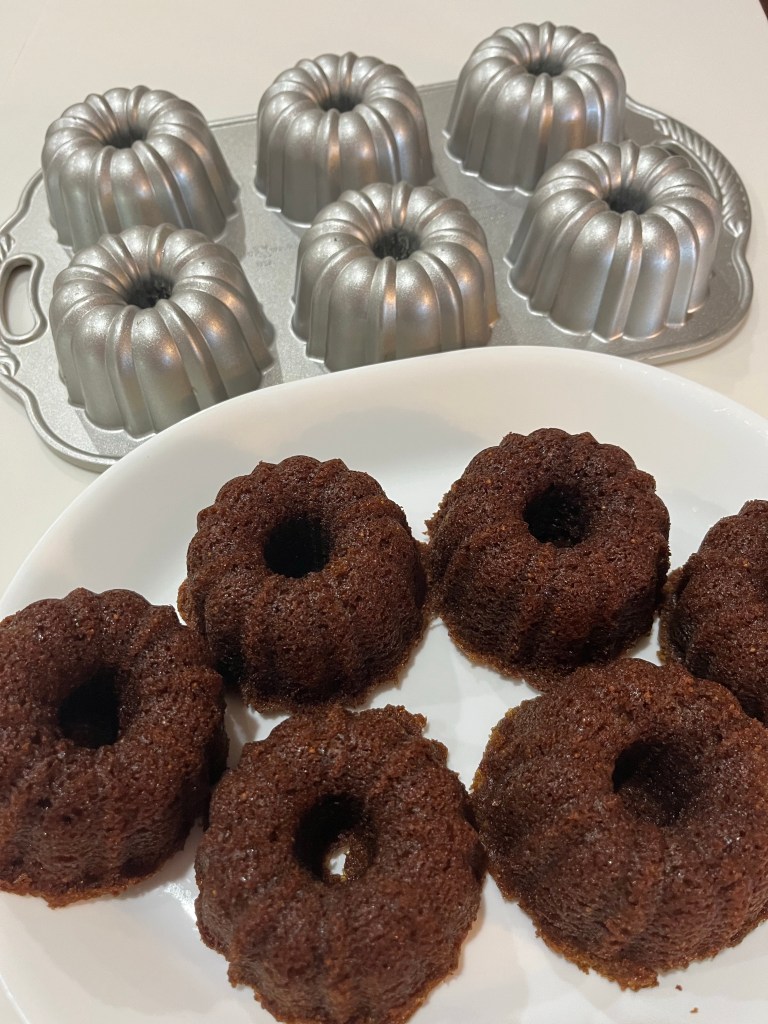 The original recipe called for a Bundt or tube cake pan but I opted for two decorative pans that I haven’t used in a while. The small well pan didn’t work great. The crumb was too big for any detail of the pan to be well defined, but it did make nice bite sized mini-cakes.