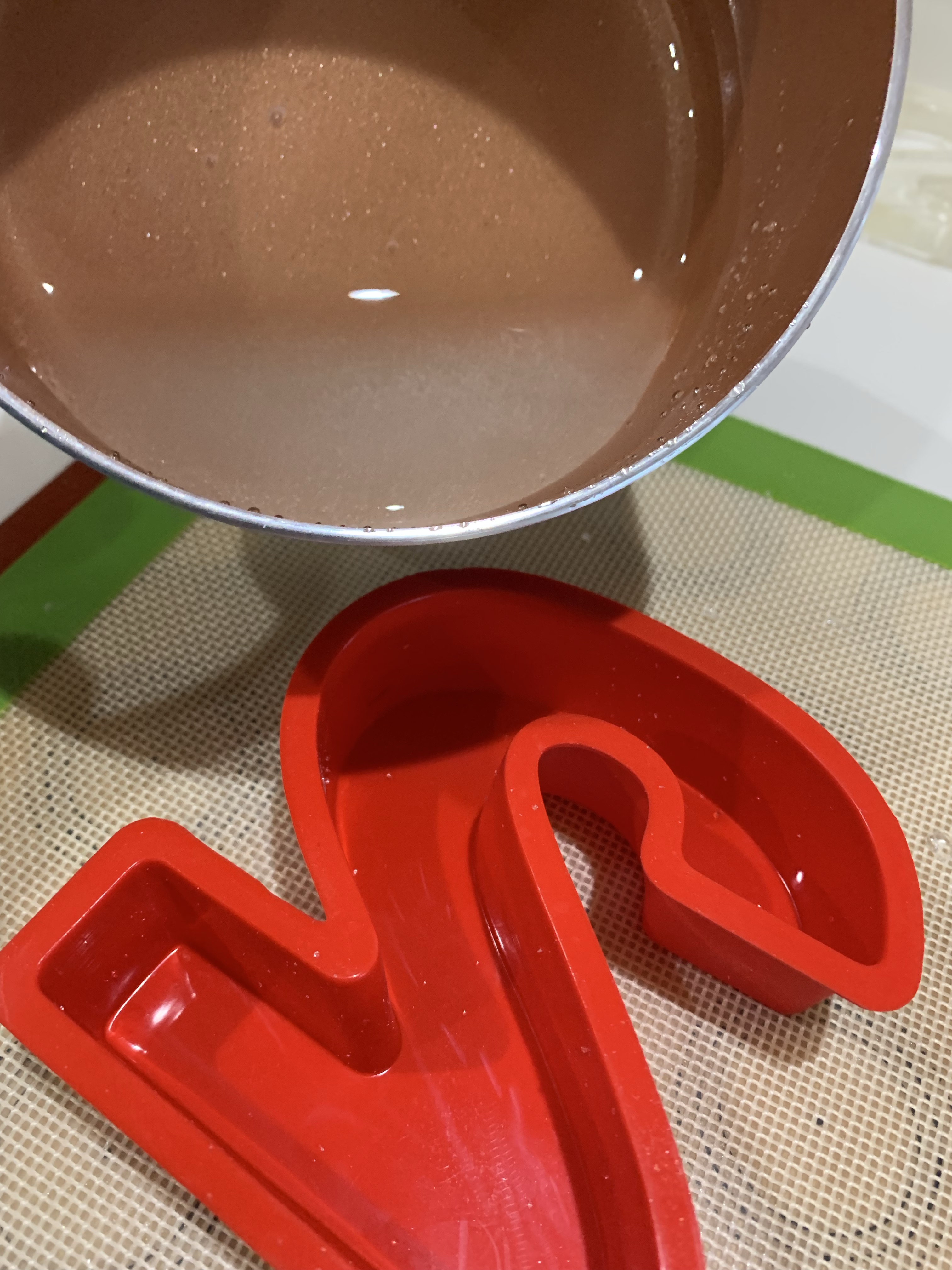 - Remove from heat and let sit for a few moments to allow the bubbles to subside then place the hot pan in water for a few seconds to stop the isomalt cooking.