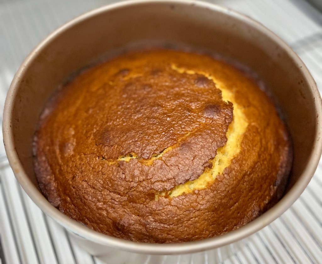 - Bake cake until golden and a tester inserted into the center comes out clean, about 1 hour. Transfer pan to a wire rack and let cake cool in pan.