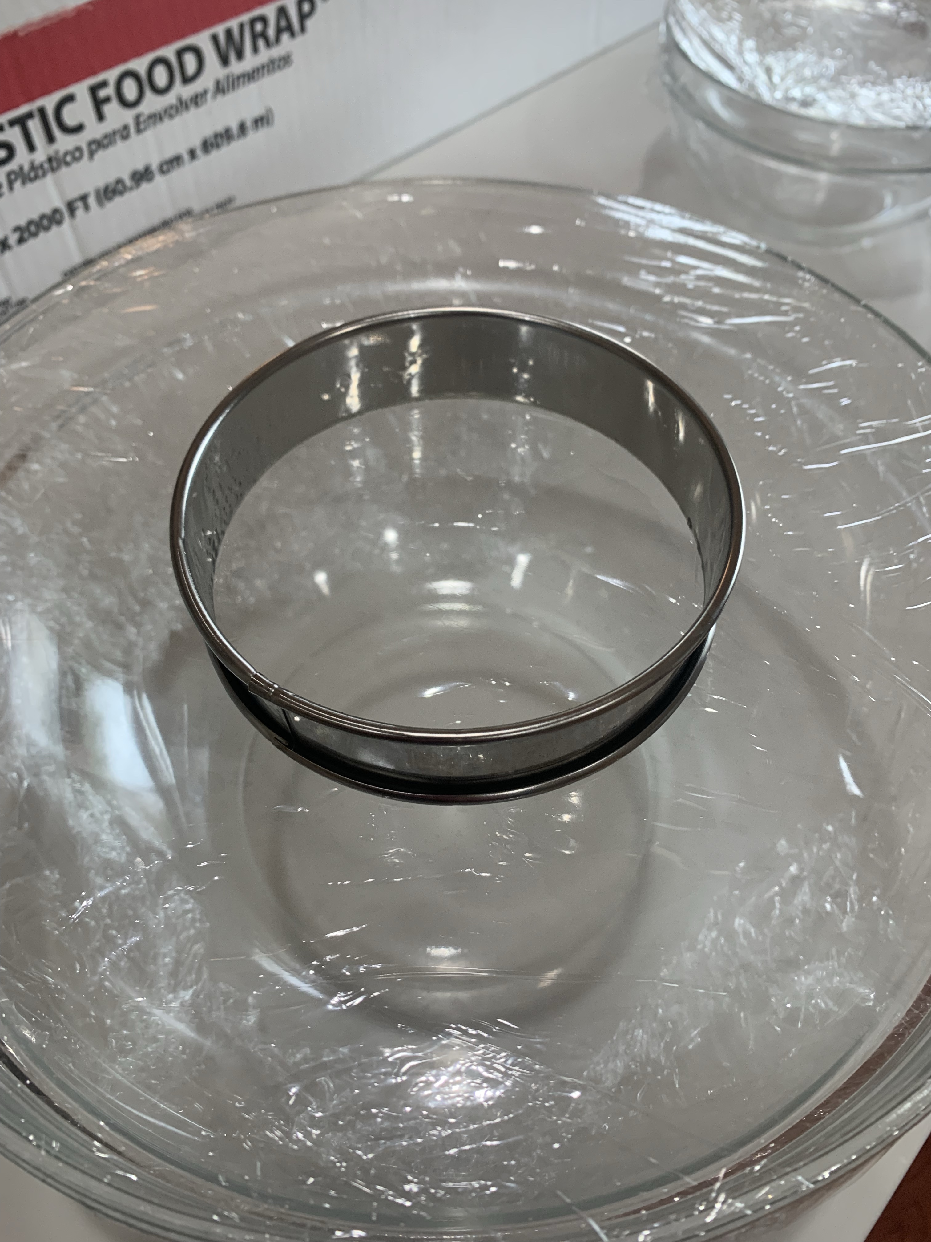 L – Once the sugar reached hard crack at 300 deg F I had no time to take pictures. R – Ring resting on plastic wrapped covered bowl.