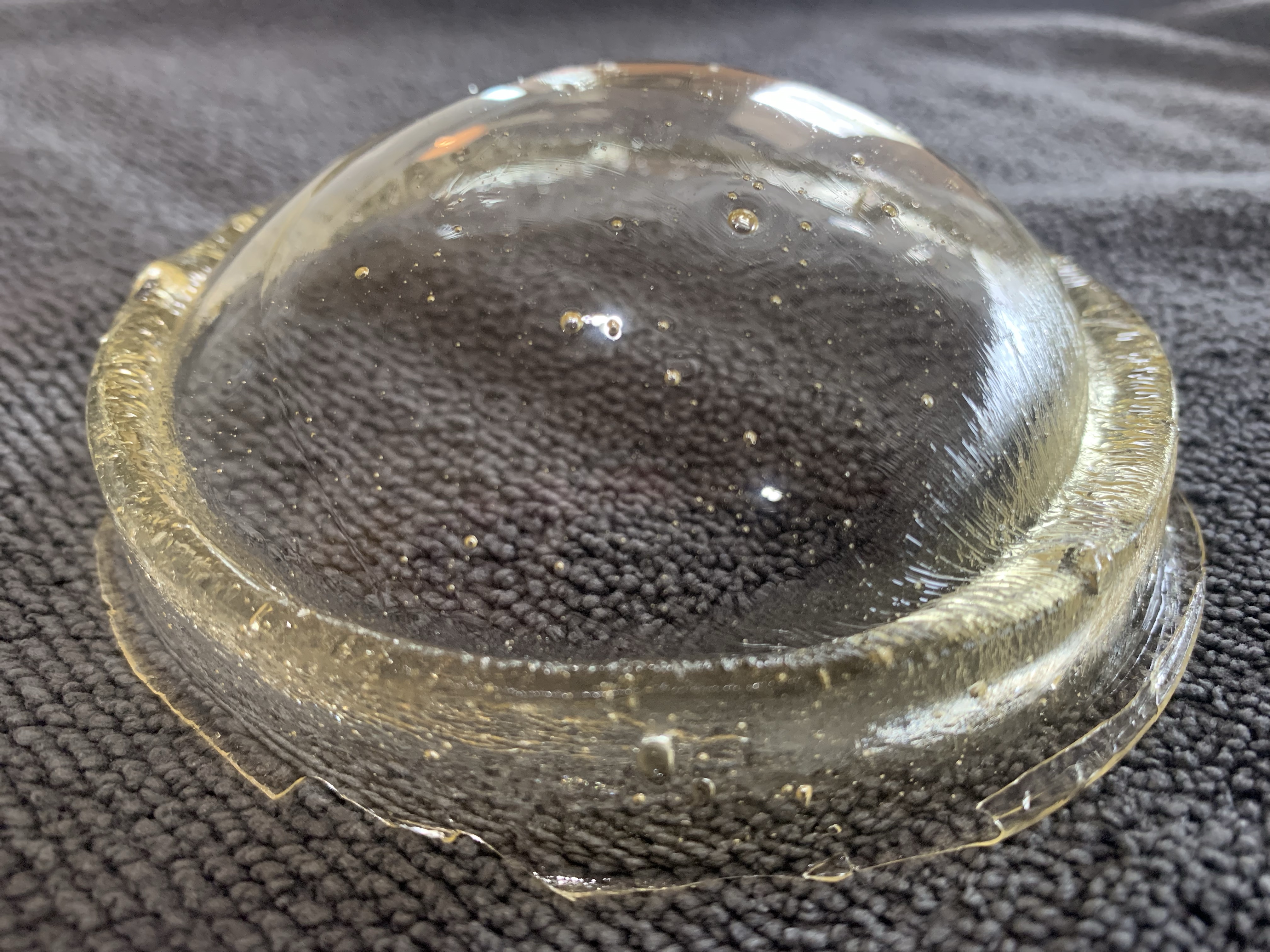 I tried this many, many times with varying degrees of success. If you use too much sugar the bottom edge of the dome will be very thick and unattractive. If you use too little sugar the dome will be thin or incomplete and either deflate or crack. More attempts than shown here were re-melted.