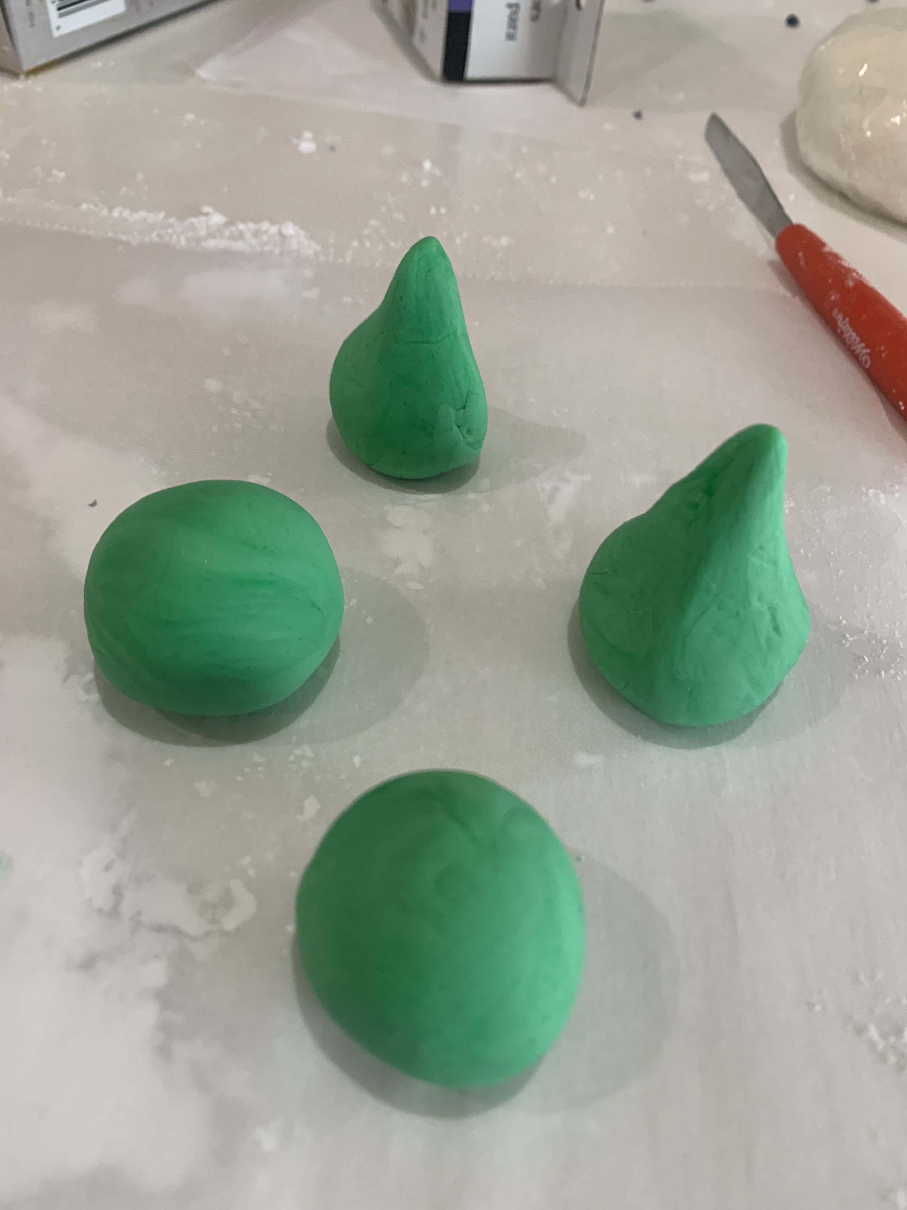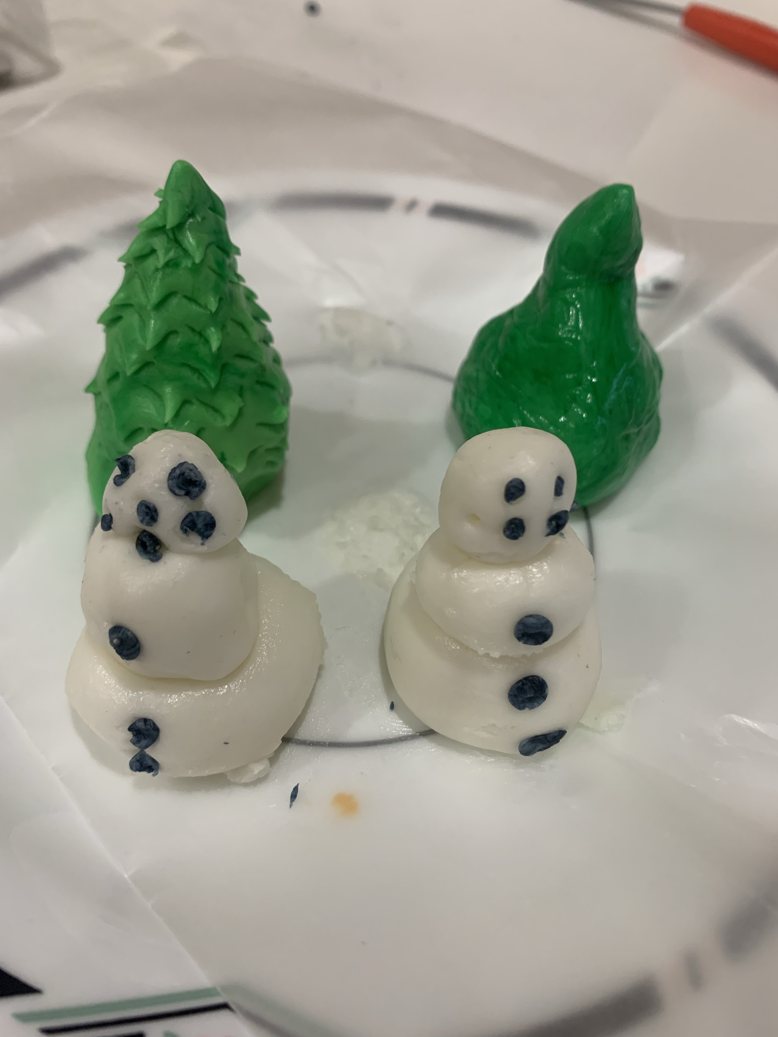 I made some white gum paste and rolled a little into balls for the snowmen. I colored some black to make buttons, eyes etc. I dyed some green and shaped it into cones. Another YouTube video demonstrated how to use cuticle scissors to snip bits to make the boughs of the trees.
