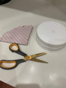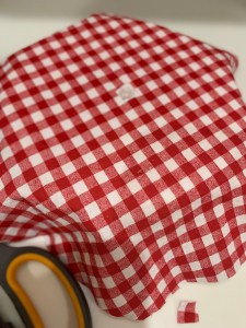 The cake was put on a 5” cake board which I had cut in its center, then it was crumb coated and covered in fondant. The flexible tubing was fed up through the cake board, cake and fondant and the funnel attached. The other end was fed through the checkerboard ‘tablecloth’ and two 5.25” styrofoam disks with holes cut in the center. The bottom disk had a channel cut from the bottom center to the edge to have a place for the tubing to run to the outside.