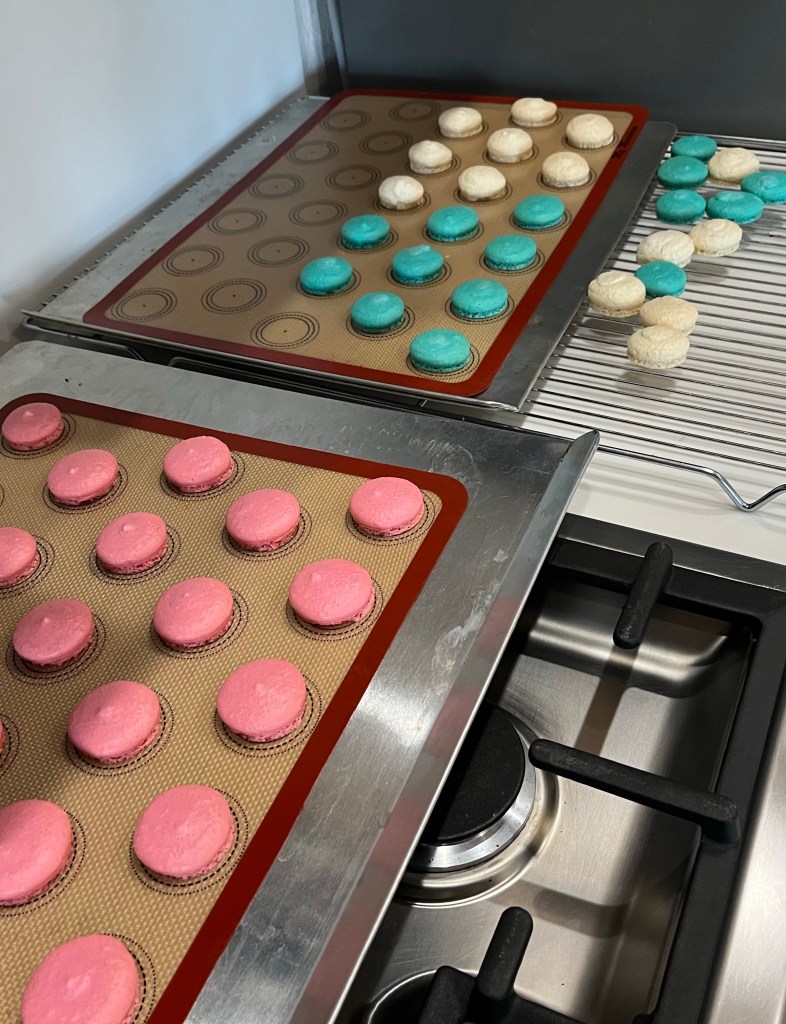 The teal macarons are filled with homemade plum jam, the pink with plum/raspberry jam and the white with hazelnut butter. They all taste good, but the hazelnut butter didn’t adhere well and the cookies tended to separate. QC suggests using a tart filling like lime or lemon curd to balance the sweetness of the macaron.