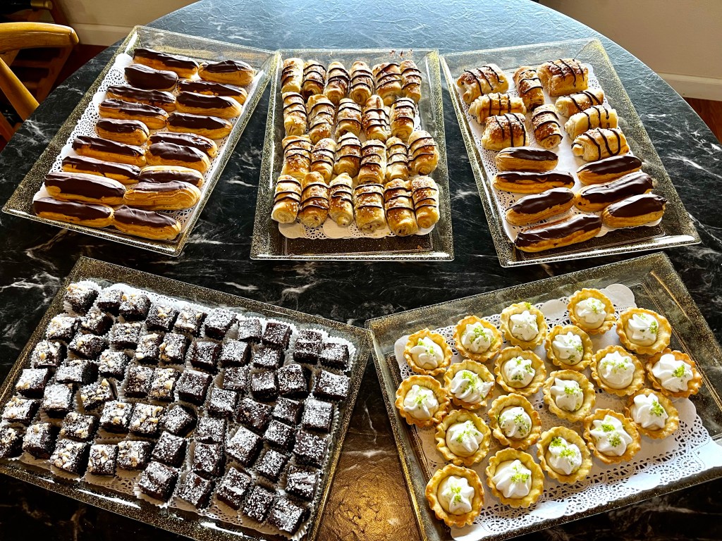 Over the last week or so I made and froze choux pastry for the eclairs and shells for the tarts. I made all the fillings yesterday and assembled everything this morning except the pain au chocolat which I made in its entirety this morning. (They don’t take very long.)