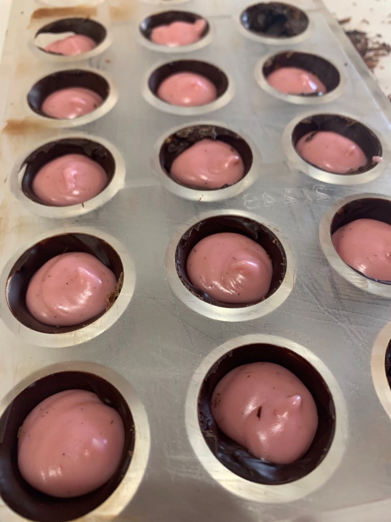 Once complete, I piped each chocolate coated well about 2/3rds full and let it set. Once set, I re-tempered the chocolate, poured it over the filled chocolate and let it almost set before scraping the bottom clean. It’s always a challenge to bang the finished chocolates out of the mold, but just keep banging them and eventually they will release.