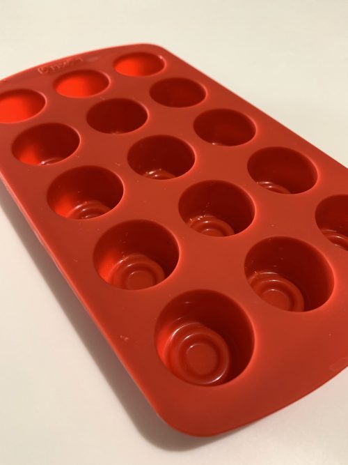 Once complete, I piped each chocolate coated well about 2/3rds full and let it set. Once set, I re-tempered the chocolate, poured it over the filled chocolate and let it almost set before scraping the bottom clean. It’s always a challenge to bang the finished chocolates out of the mold, but just keep banging them and eventually they will release.