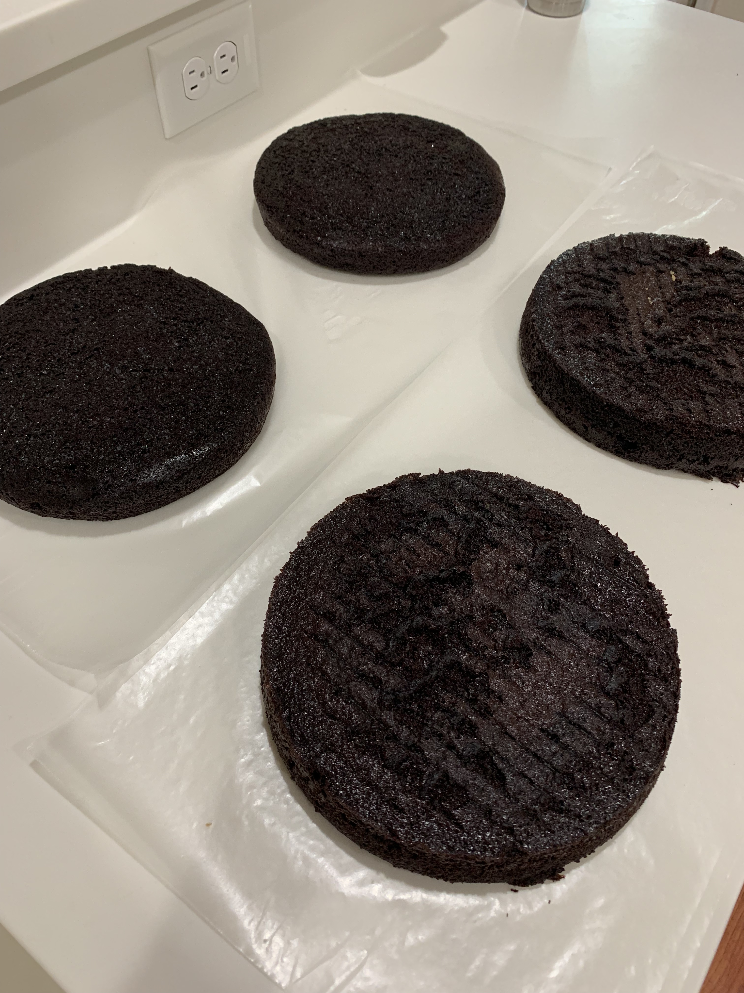 The cake was comprised of two 12″ round merengue white cake layers and three 9″ chocolate layers. Each were crumb coated and refrigerated.