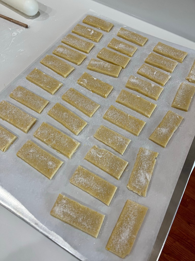 - Divide the dough in half. Roll each half between two sheets of parchment paper into a rectangle (about ¼-inch thick).