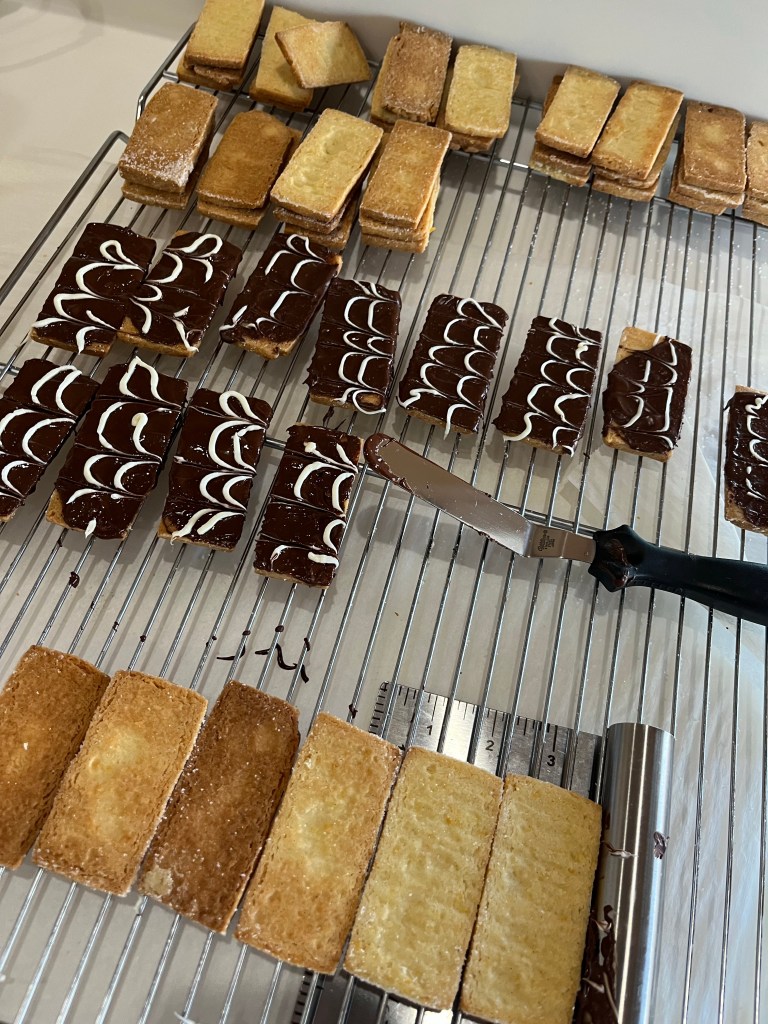 b. Also, cut both frozen logs in half and slice one while leaving the others in the freezer - The cookies spread and lost definition. Next time I will freeze for 30 minutes after slicing and arranging on the parchment lined cookie sheets